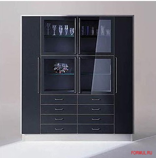 Алюминево-серый цвет фасада. Темные серые лакированные металлические двери, ящики, полки.