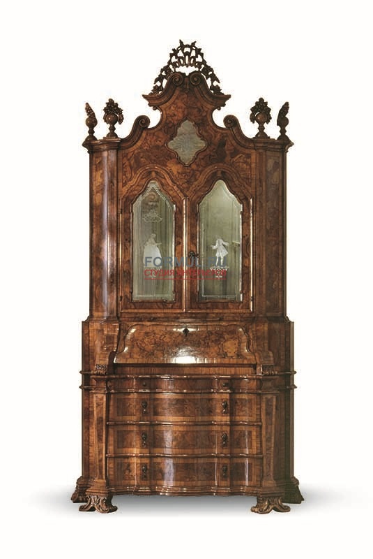 Буфет с большими выдвижными ящиками и секретером. Каркас из ели, пиленый шпон из корня оливкового дерева.