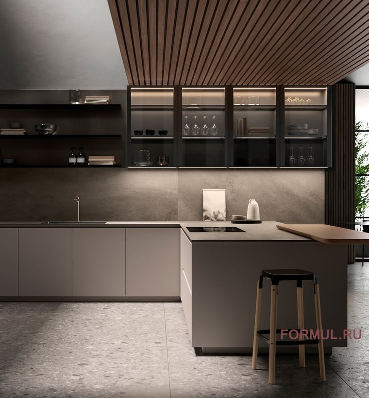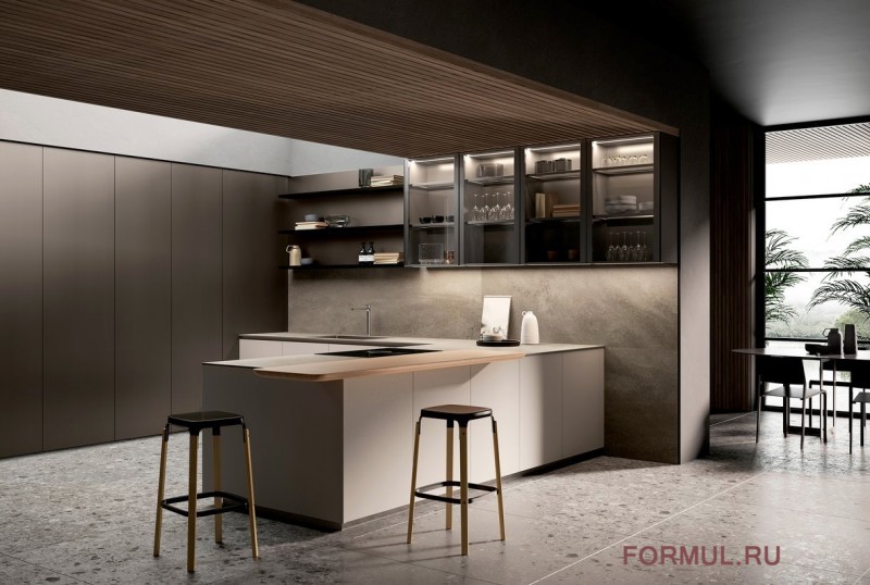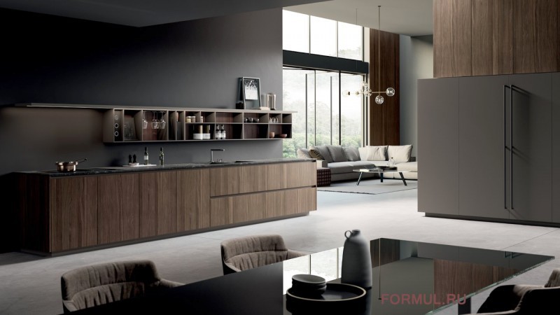 ONE — кухня в современном стиле, функциональная и универсальная.Встроенные открытые блоки и вместительные шкафы позволяют оптимально использовать пространство. Остров задаёт настроение этой тёплой, изысканной комнате. Пространство расширяется и объединяет кухню и гостиную.Уникальные функциональные композиционные решения для идеальной обстановки семейной жизни.