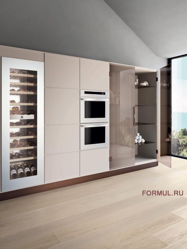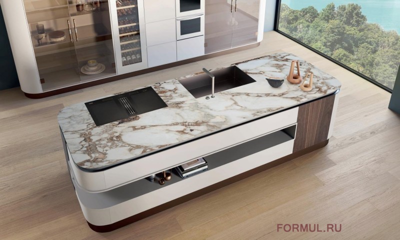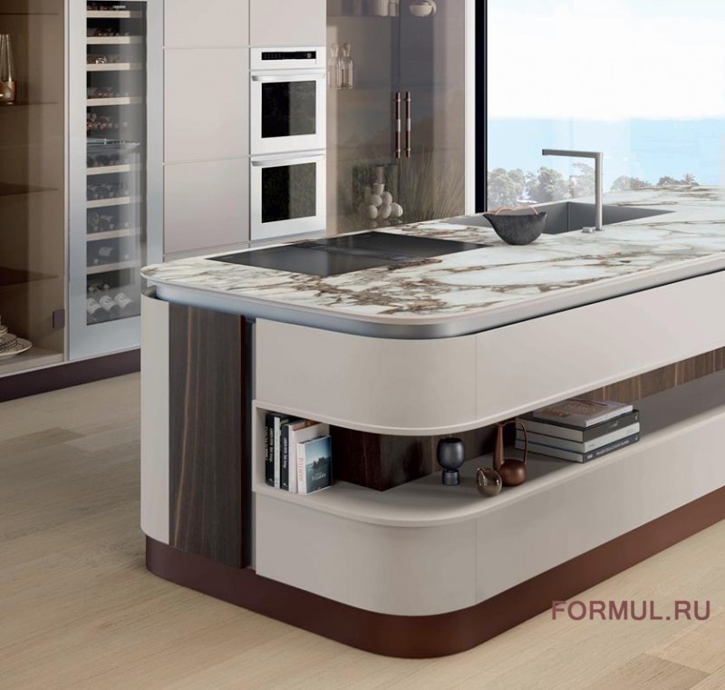 На кухне последовательность мягких форм и изогнутых линий создает утонченное пространство. Мягкие матовые оттенки отделки, дерево Rovere Etna и изысканный зернистый рисунок столешниц отражают естественный свет, льющийся из окон, создавая светлое пространство. Гладкие дверцы шкафа привносят в кухню нотку минимализма, компенсируемую изысканностью деталей и аксессуаров. Большие витринные шкафы становятся идеальной витриной для самых красивых предметов. Идеальный баланс порядка и отображения. Мягкие цвета, изысканные детали и современная отделка в сочетании с новейшими технологиями создают пространство, в котором красота и функциональность соответствуют требованиям современной жизни.