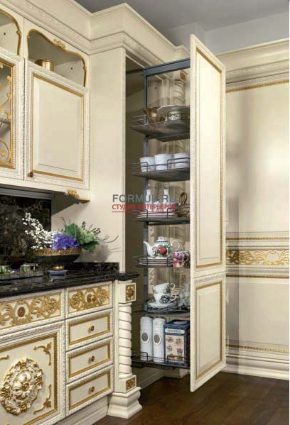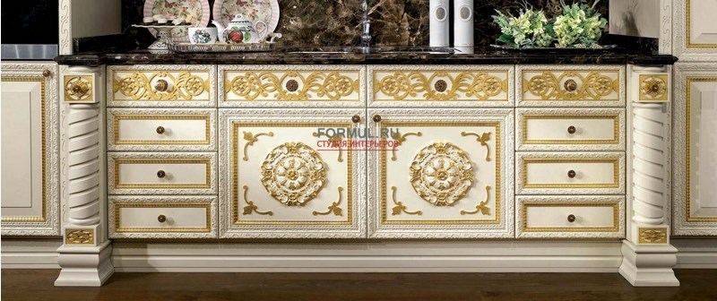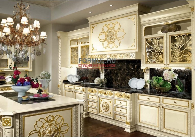 характеризуется большим количеством красивых расцветок, украшений, резных рамок и других декоративных элементов. Благородное и аристократическое искусство, заложенное в дизайне, и ручная работа позволили создать уникальную неповторимую модель кухни самого высокого уровня.