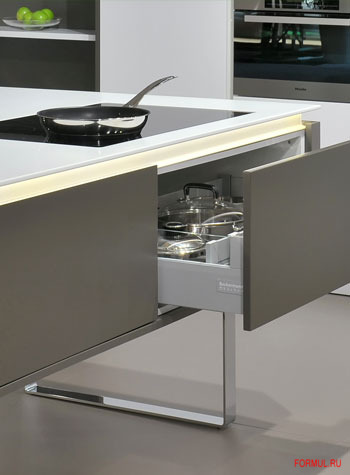 В центре помещения модули без ручек и остров, легко «парящий» благодаря металлической опоре. Здесь больше места для приготовления пищи, семейного отдыха, приема гостей и для взгляда по-новому на будничные заботы.
