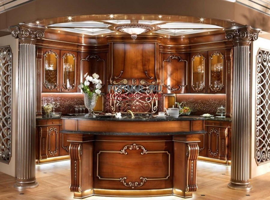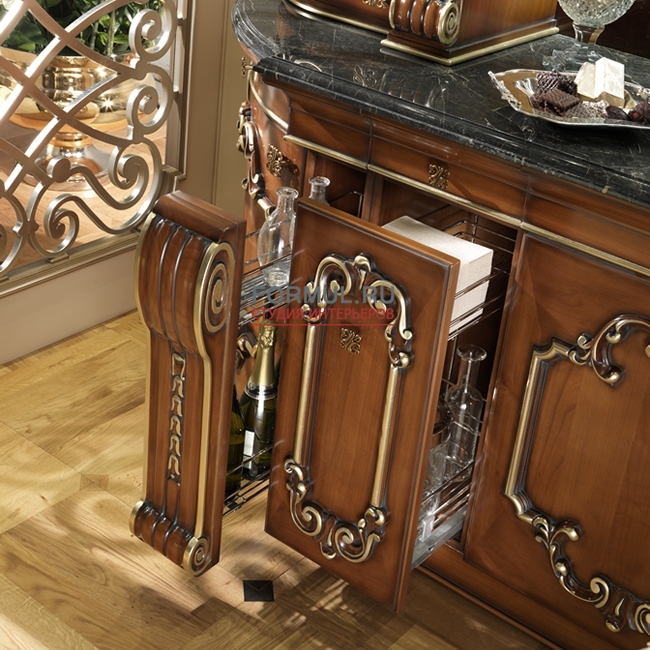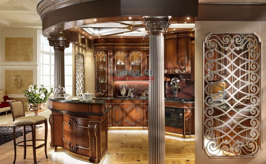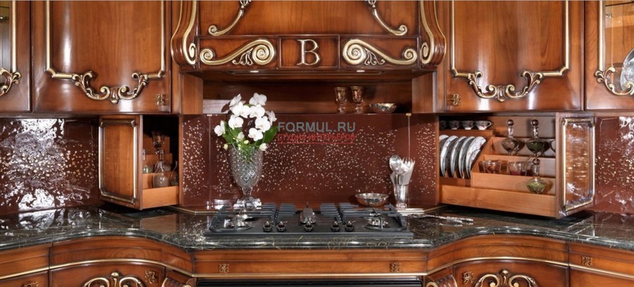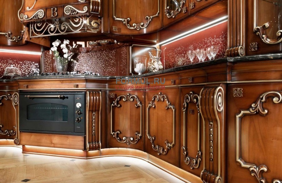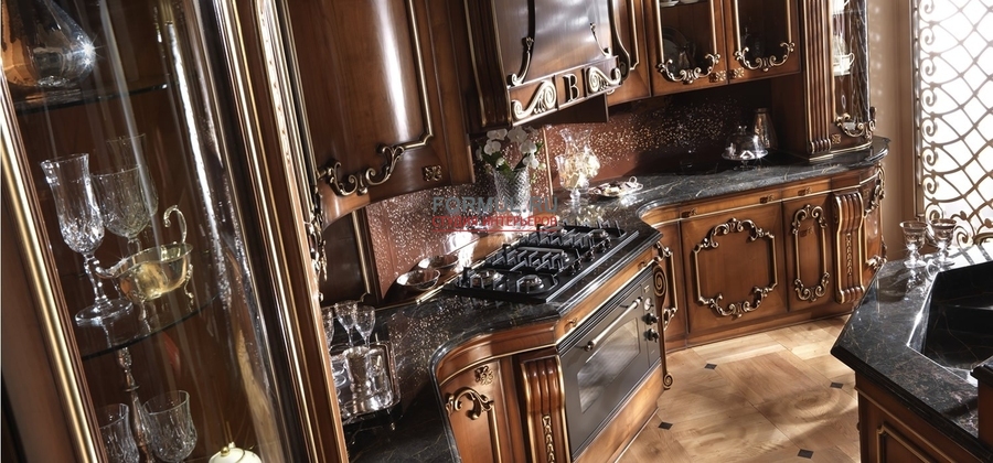 Итальянская фабрика Bordignon Camillo выпустила изысканную и роскошную кухню Teatro, которая совершенно меняет представление о назначении этой рабочей зоны в доме. Выполненный из массива вишни проект Teatro искусно декорирован уникальной резьбой и патинирован золотой фольгой. Классическая кухня Teatro восхищает столешницей, созданной из натурального мрамора, а также ажурным каркасом на внешней стороне. Особое очарование гарнитуру придаёт подвесной потолок с интегрированными светильниками, которые создают романтическую обстановку. Кухня Teatro отличается уникальностью, поэтому имеет несколько цветовых решений и вариантов комплектации, о которых вы можете детальнее узнать у консультантов на нашем сайте.