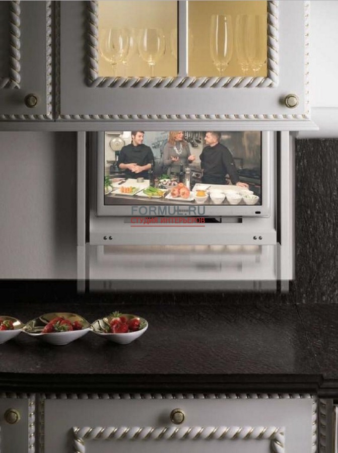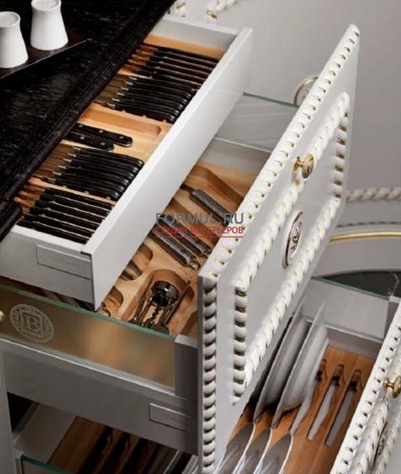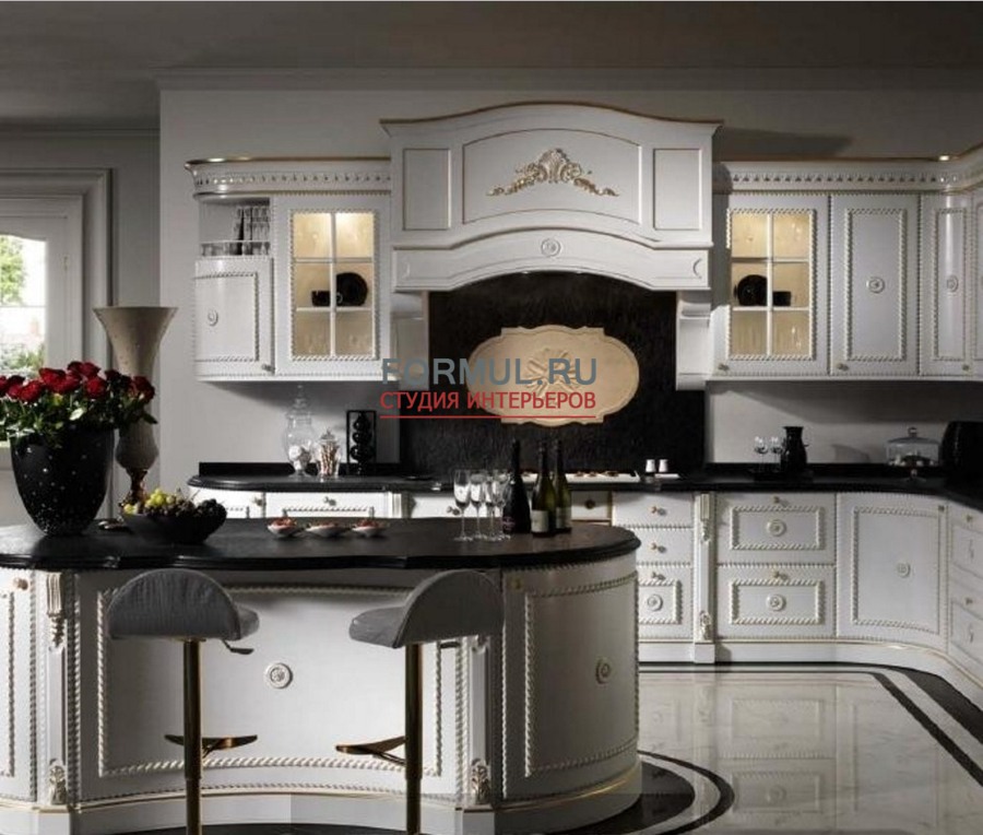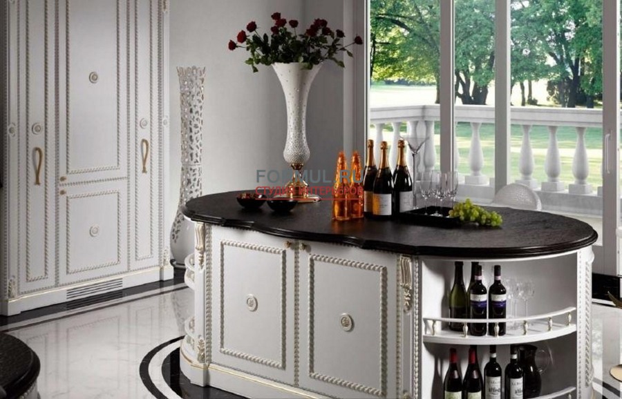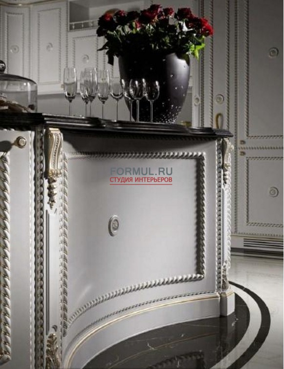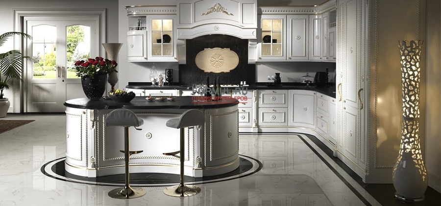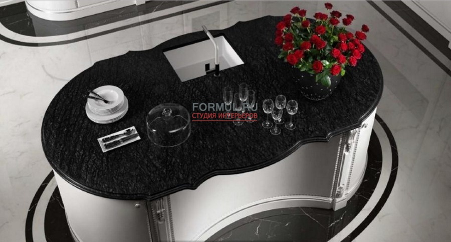 Элегантная кухня-остров Tivoli от талантливых дизайнеров итальянской фабрики Bordignon Camillo неустанно восхищает и вдохновляет настоящих ценителей классики. Фабрика сделала главный акцент в модели Tivoli на великолепную комбинацию 3 цветов и материалов: белого дерева, чёрного натурального мрамора и инкрустации, выполненной в золоте. Остров представлен в овальной форме и может использоваться как изысканная барная стойка, так и в качестве дополнительной рабочей зоны. Уникальность кухни Tivoli придают различные элементы декора, выполненные собственноручно дизайнерами фабрики.