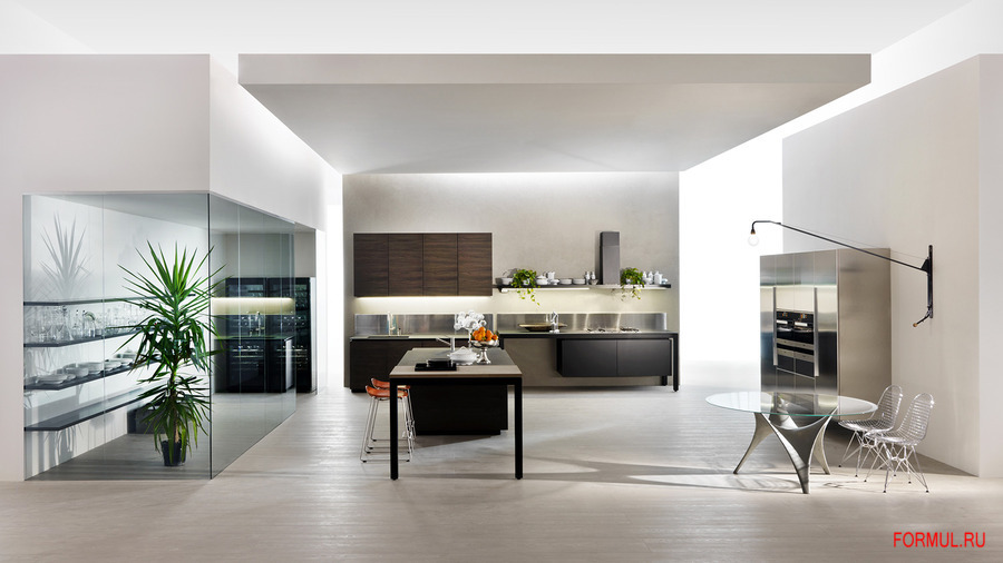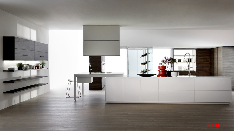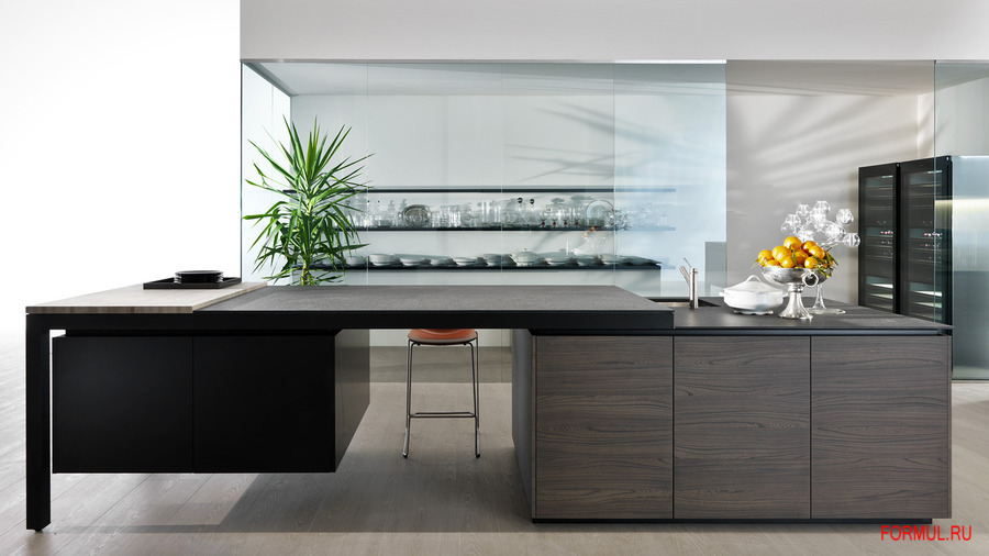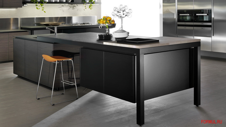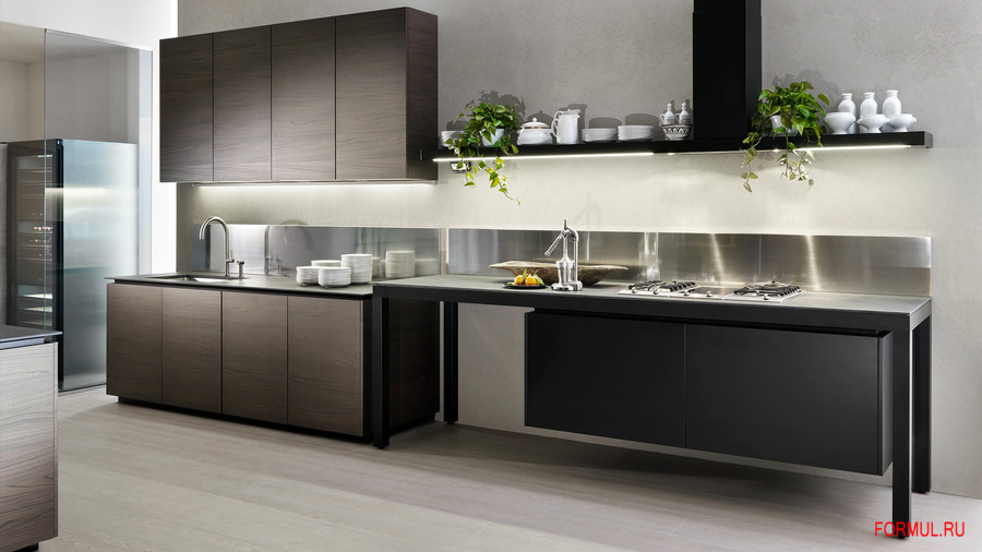 Кухня олицетворяет практичность и будет оптимальным решением при оформлении помещения в стиле минимализма. Выдвижные элементы отдельных частей кухни оснащены фурнитурой blum.