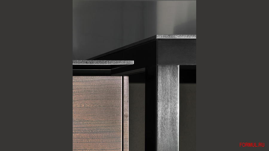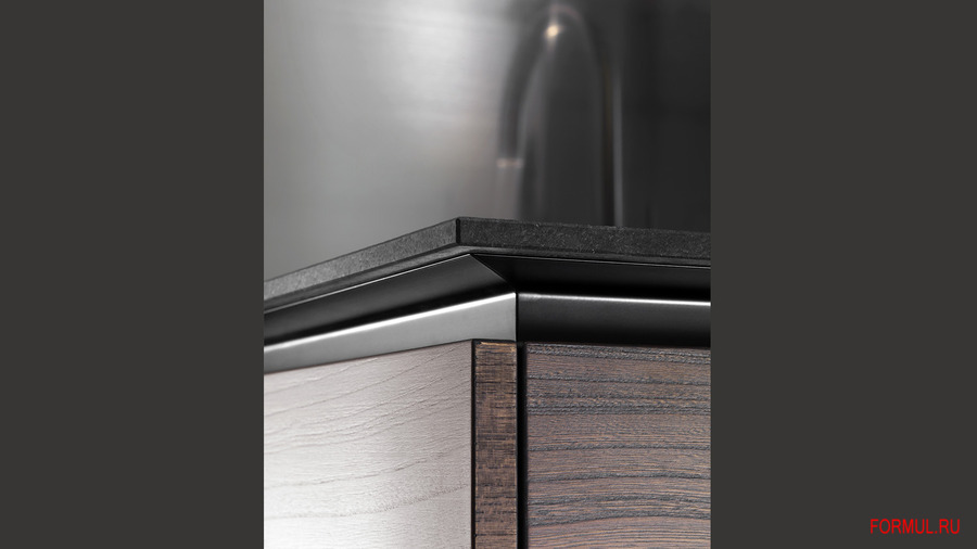 Фасады изделий обработаны матовым лаком, а алюминиевые каркасы придают четкость и выразительность линиям кухонной мебели.