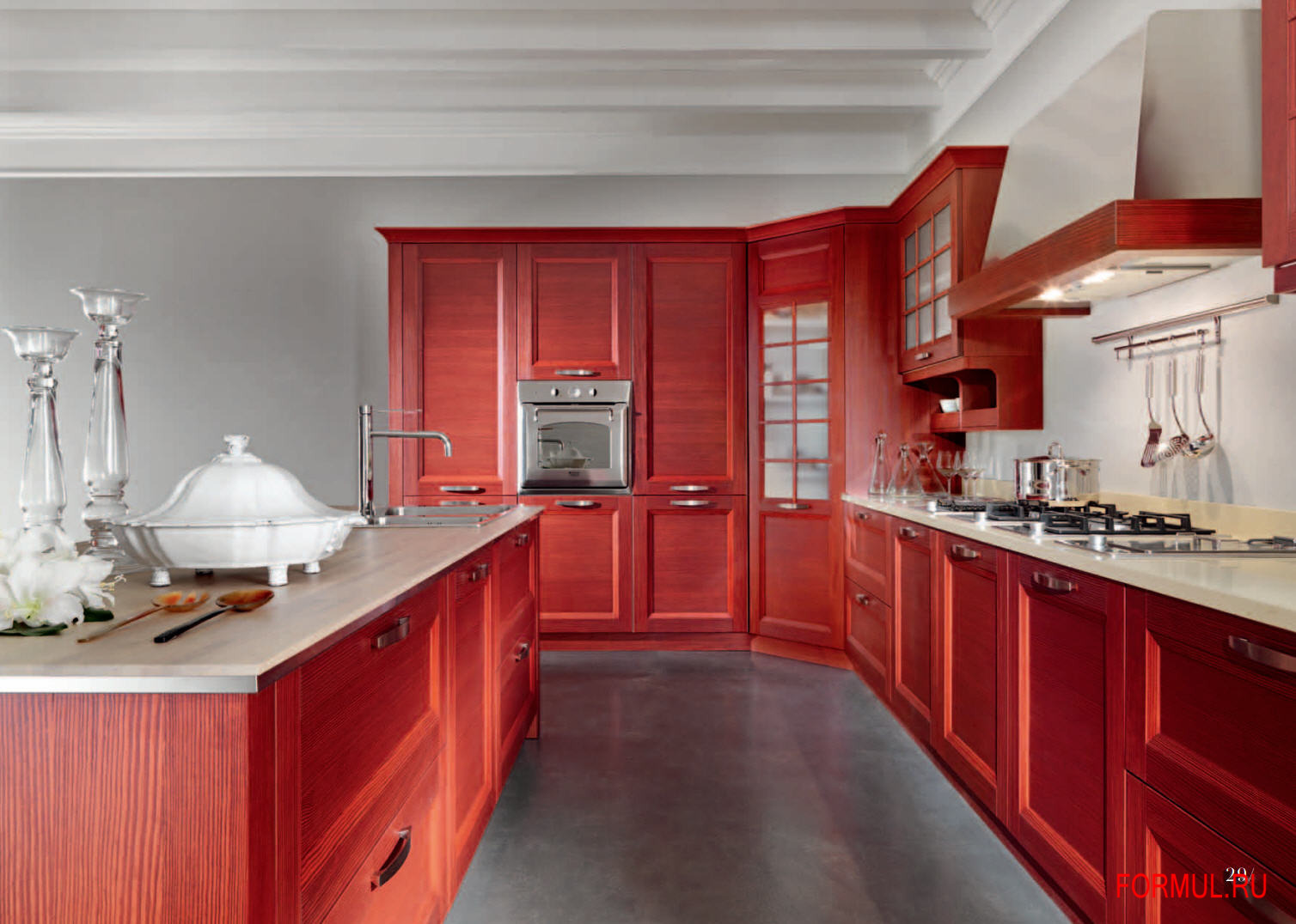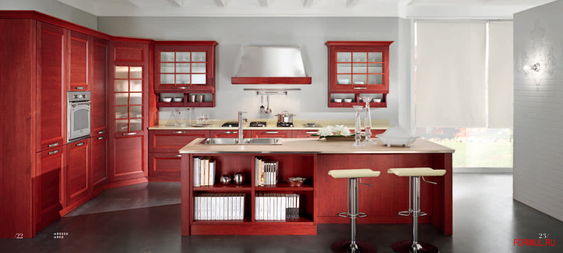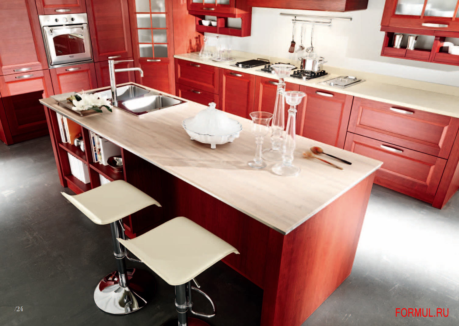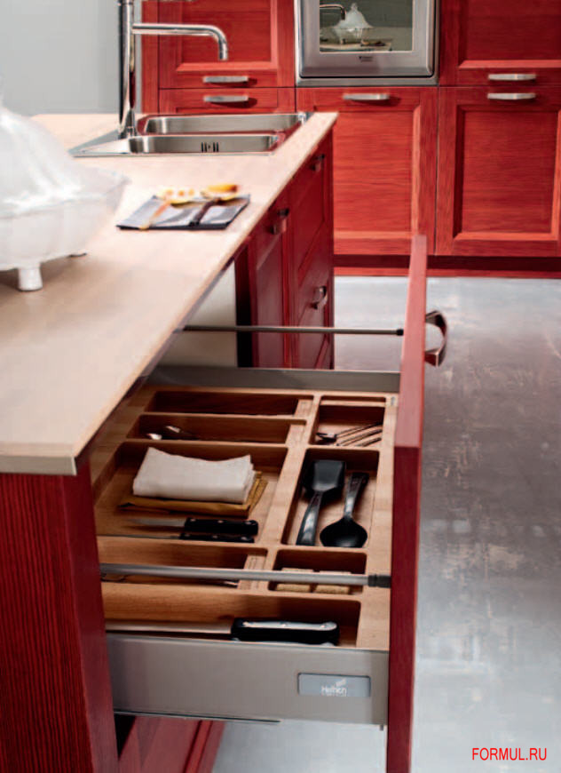 Кухонный гарнитур, от итальянского производителя Vismap. Возможно изготовление модулей разной глубины. Включает глухие и застекленные модули для хранения. Цветовая гамма из натурального дерева.