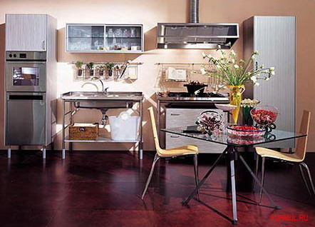 Кухня включает в себя ряд компонентов серии Fuoko: 2 высокие модели с ребристыми алюминиевыми дверьми: для холодильника, для духовку и посудомоечной посуды, мойка из нержавеющей стали.