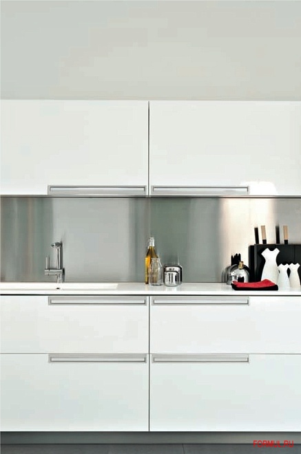 Модель "Ecletica" может быть в следующих отделках: ламинат, матовое окрашивание или глянцевое окрашивание. Толщина створки = 19 мм. Если створка имеет глянцевое или матовое окрашивание, то она выполнена из МДФ. Если отделка створки ламинат, то она выполнена из ДСП европейского стандарта класса Е1. Отличительной чертой этой модели являются ее необычные ручки, которые можно увидеть на изображении. Внутренняя часть ручек может быть в следующих отделках: матовое или глянцевое окрашивание или стекло.