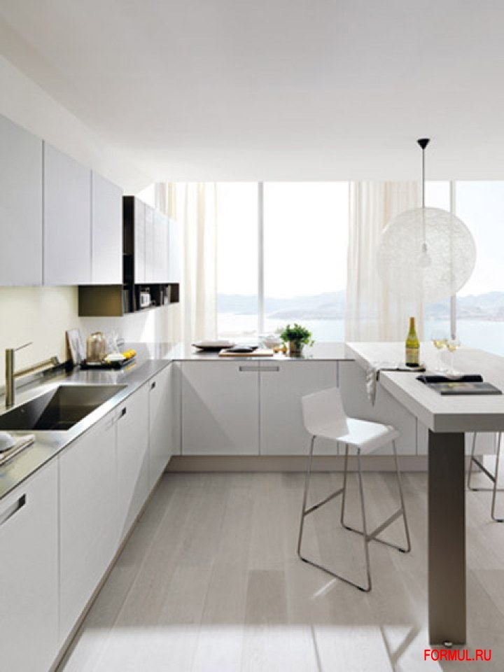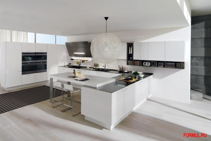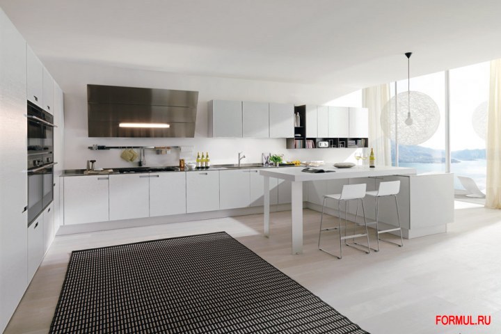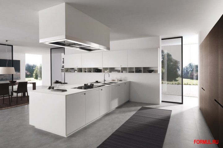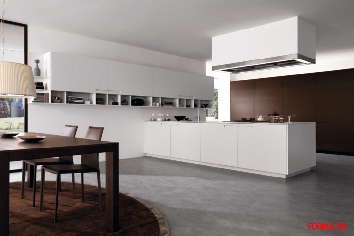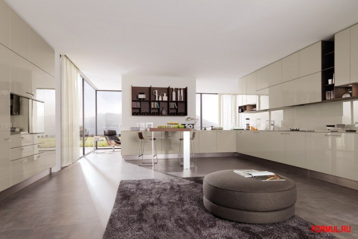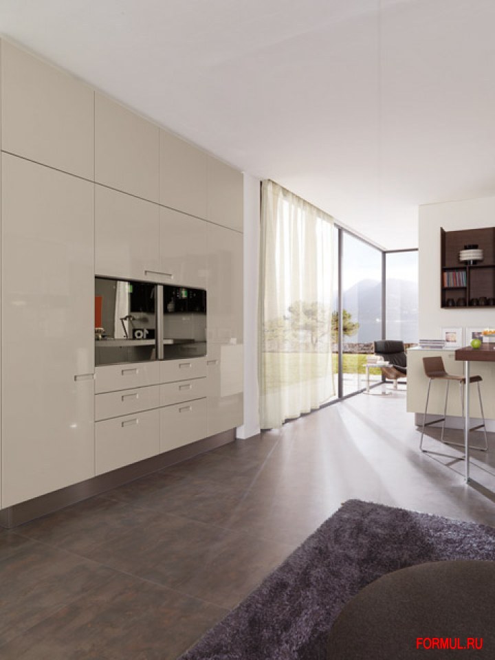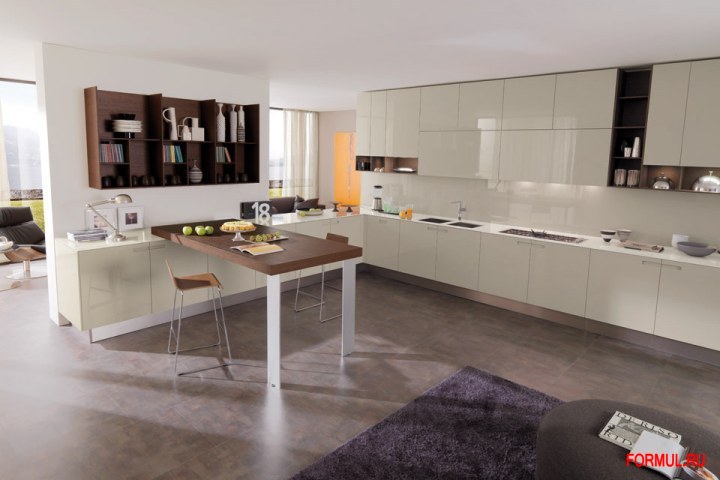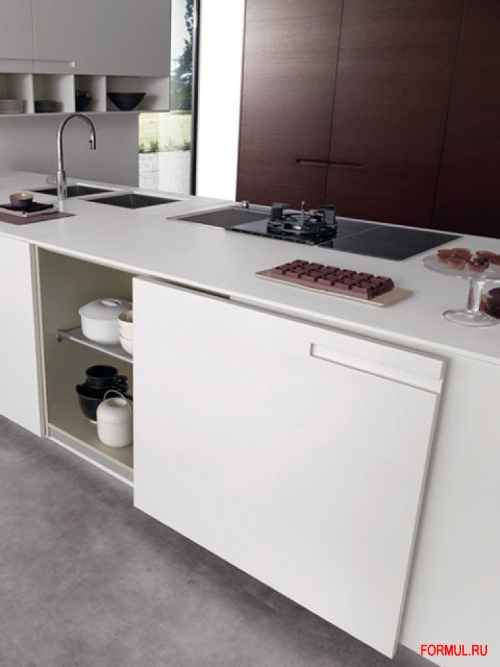 Богатая цветовая гамма палитры деревянных фасадов и огромный выбор оттенков рабочих поверхностей дает возможность создать исключительно оригинальные и необычные кухонные ансамбли, гармонично дополняющие отделку помещения. Оснащение подвесных шкафов led-лампами служит не только второстепенным источником освещения помещения кухни: подсветка рабочих поверхностей становится полноценным элементом декора, подчеркивающим натуральную текстуру мебели. Удобная система открытия дверей pull&slide, изготовленная из стали, делает кухонную мебель Assim более эргономичной, в очередной раз направляя внимание на изысканный стиль от Euromobil.