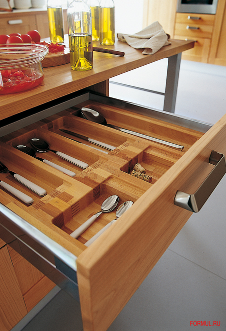 Фасады кухни Naturasia могут быть дополнены плоскими стальными ручками либо другими вариантами из коллекций фабрики Ged cucine.
