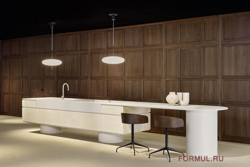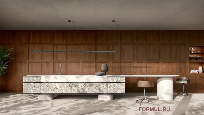 Центральный остров Archetipo с персонализируемой отделкой дополняет помещение кухни, вмещая в себя функциональные рабочие решения, такие как раковина и варочная панель, ящики и закрытые отсеки, а также большую столешницу, которая удлиняется и превращается в стойку.