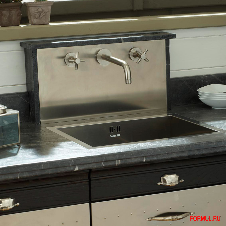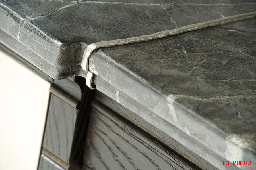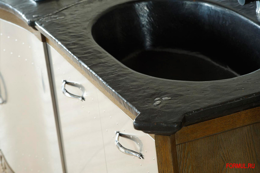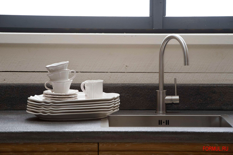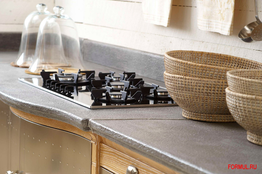 Материалы рабочей поверхности: cocciopesto (кочиопесто) – искусственный камень на основе дробленой черепицы, кварцевого порошка и органических смол; мрамор в цветах из ассортимента фабрики (благодаря специальной обработке на поверхности мрамора остается меньше грязи).