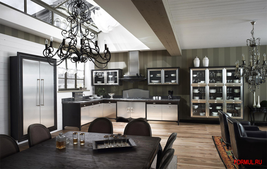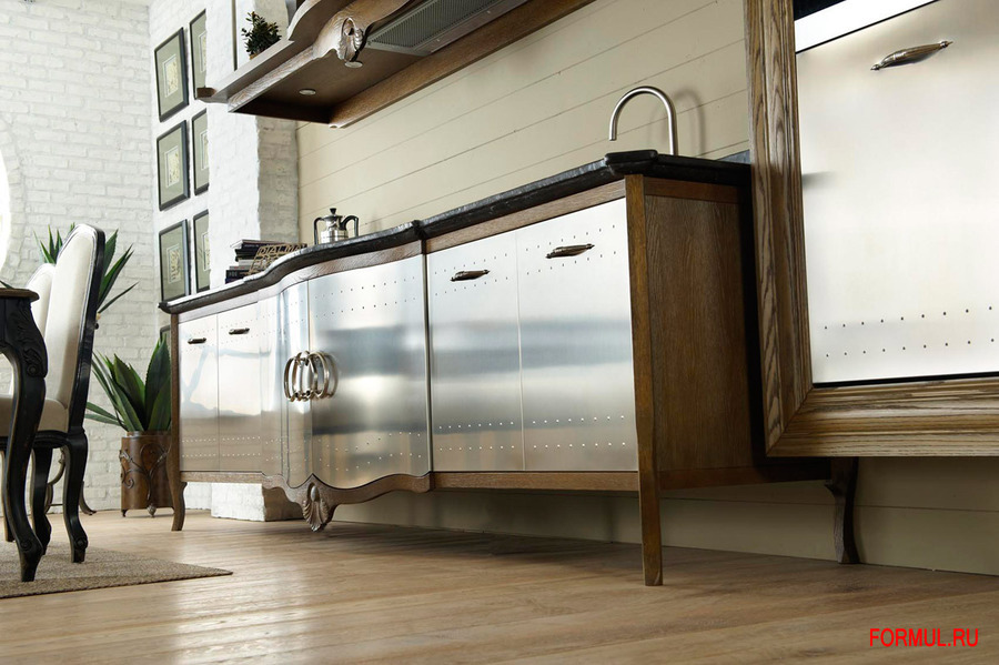 Здесь изящная резьба по дереву на удивление гармонично сочетается с полированной сталью и заклепками, прямолинейная холодность хай-тека обрамлена здесь в чувственность старины.
