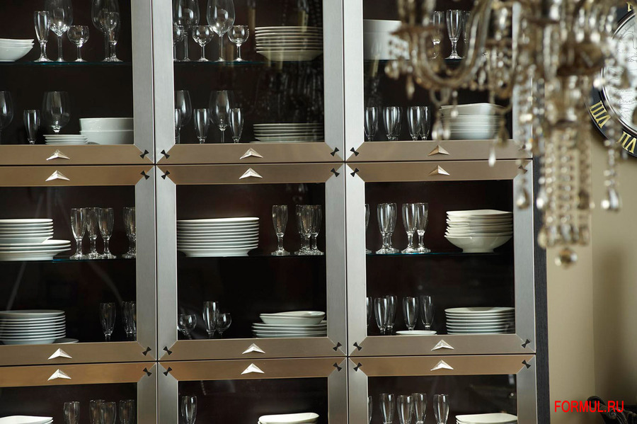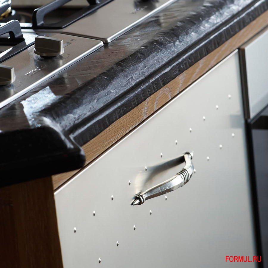 Напольные модули оснащены регулируемыми под неровности пола ножками высотой 12 см, которые скрываются плинтусом из массива древесины (толщина – 18 мм) с 1-см покрытием из нержавеющей стали.