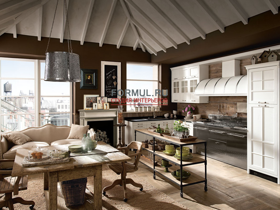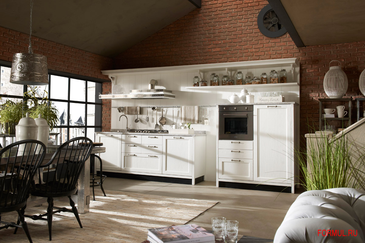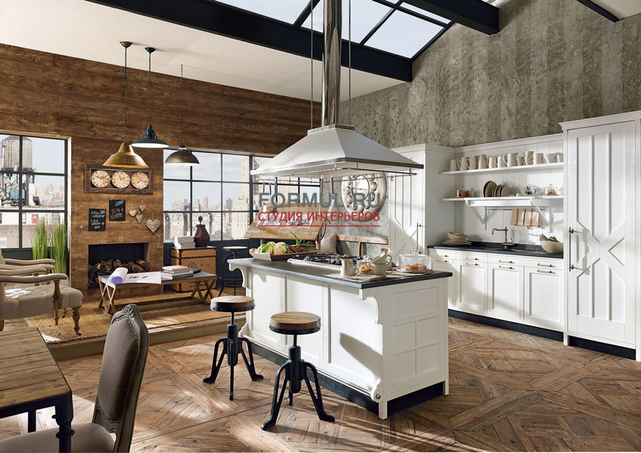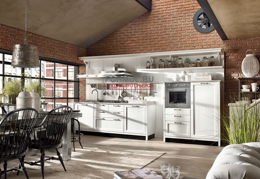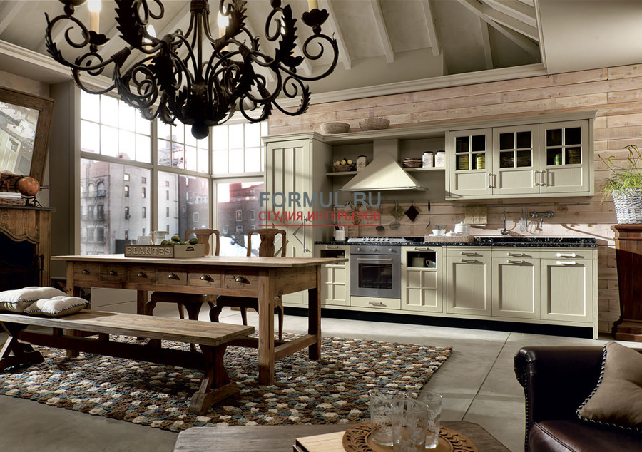 Одновременно с этим нарочитая «небрежность» остальной кухонной мебели делает замысловатый отсыл к кухням в стиле кантри.