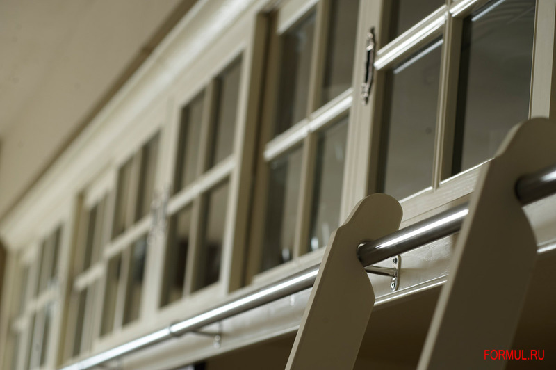 Напольные модули оснащены регулируемыми под неровности пола ножками высотой 12 см, которые скрываются плинтусом из массива древесины (толщина – 22 мм). Навесные шкафы имеют кабель-отверстия диаметром 1 см.