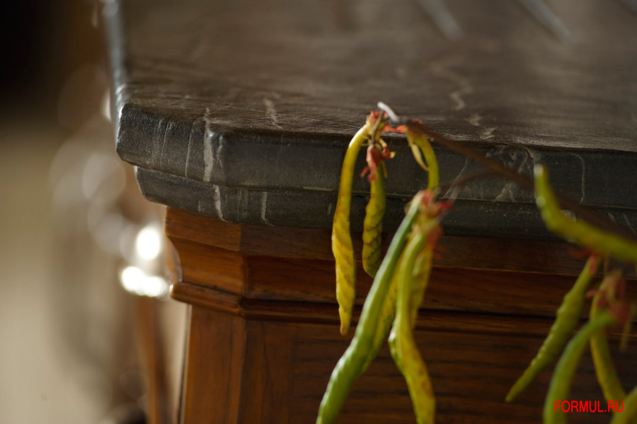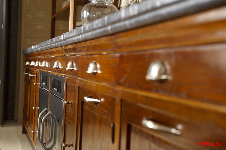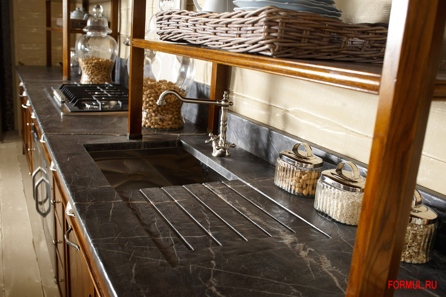 Материалы рабочей поверхности: массив дуба толщиной 5 см (отделка цвета фасада); мрамор в цветах из ассортимента фабрики (благодаря специальной обработке на поверхности мрамора остается меньше грязи).