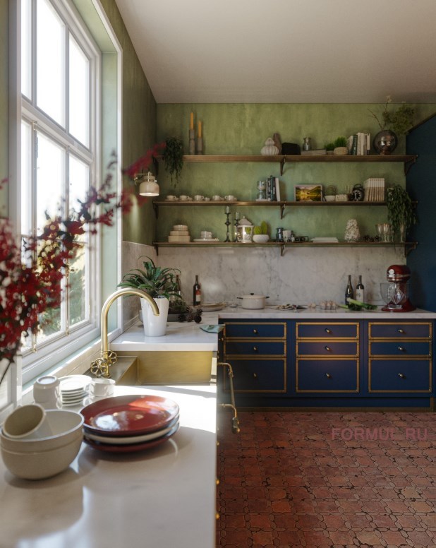 Эта кухня, где синий цвет комбинируется с теплыми шалфейно-зелеными тонами, выполнена в безупречно «зимнем» и уютном стиле. Такие оригинальные решения, как встроенный в нишу варочный комплекс с мраморным фартуком и выдвижной вытяжкой, являются образцовым примером экономии пространства в помещении. Моечная зона расположена под большим, залитым светом окном: речь идет об идеальном месте для установки мойки.