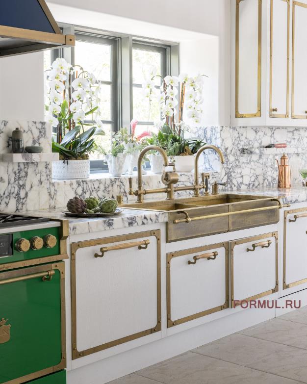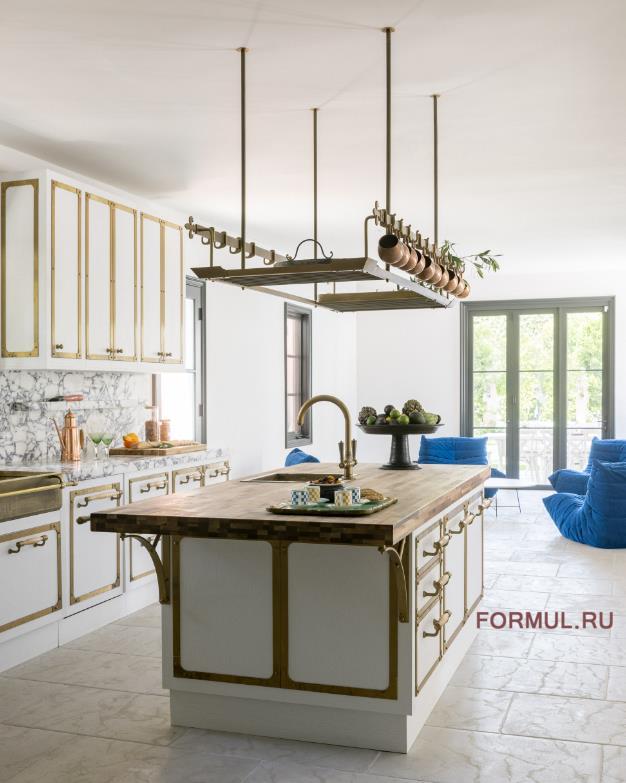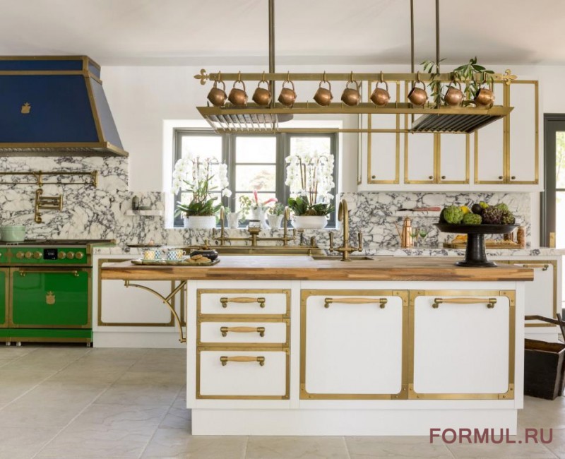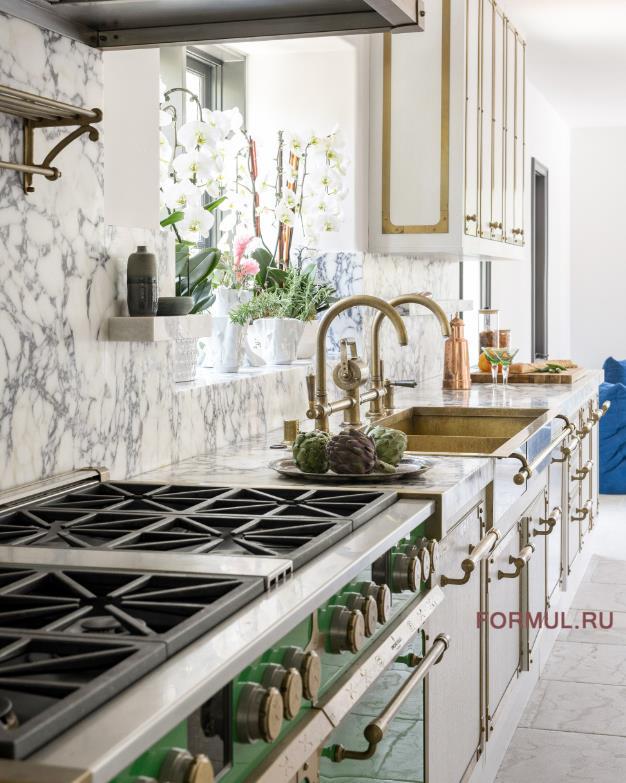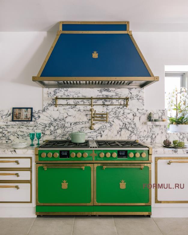 В этом ярком и характерном проекте на великолепной вилле в Калифорнии кухонная зона оборудована кухонным блоком Fiorentina изумрудно-зеленого цвета в сочетании с небесно-голубой вытяжкой-пирамидой с деталями из полированной латуни. Полка для наполнения кастрюль и смеситель выделяются на фоне сине-фиолетового мрамора Calcutta, из которого изготовлена столешница и задняя панель. Рядом с кухонной зоной находится раковина из полированной латуни с двойным краном, освещенная естественным светом из верхнего окна. Стена дополнена подвесными шкафчиками, а также рядом приборов – многофункциональной духовкой, пароваркой и посудомоечной машиной – все это встроено в дубовый шкаф c видимой текстурой дерева белого цвета Signal с матовой отделкой и полированными латунными ручками и профилями. На противоположной стене расположены холодильник, винный погреб, морозильная камера, а также открытые полки, дверцы и выдвижные ящики, которые обеспечивают достаточно места для хранения. В центре комнаты находится изготовленный на заказ остров с подвесной полкой для кастрюль, выполненной из полированной латуни и столешницей из заламинированного ясеня, а также раковиной с изогнутым изливом.