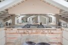 Проект представляет собой кухню в форме буквы «U» с двумя параллельными центральными островами в матовом цвете Lily White и с отделкой из патинированной латуни. Большое пространство разделено на несколько зон, каждая из которых посвящена определенной функции. Под окном находится зона для мытья с центральной полувстраиваемой раковиной из патинированной латуни, рейкой для инструментов и двойным распылительным краном с рычагом. В области под столешницей располагаются посудомоечная машина, выдвижное мусорное ведро и серия ящиков. На противоположной стене расположены колонны с холодильником, морозильной камерой и винным шкафом. Над ними верхние шкафы с откидными дверцами. Слева от них – микроволновая печь, многофункциональная духовка и подогреватель. Справа – кофемашина, многофункциональная духовка и второй подогреватель. Стену завершают ряд навесных шкафов, предоставляющих обширное место для хранения. В центре один из двух островов содержит профессиональную плиту OG Professional 248 с двойной духовкой (одна статическая и одна с вентилятором), отсеки для нагревания и двойные ящики, а также профессиональную купольную вытяжку. Второй остров предназначен для мытья, с посудомоечной машиной, выдвижным мусорным ведром и рядом ящиков и отсеков для хранения.