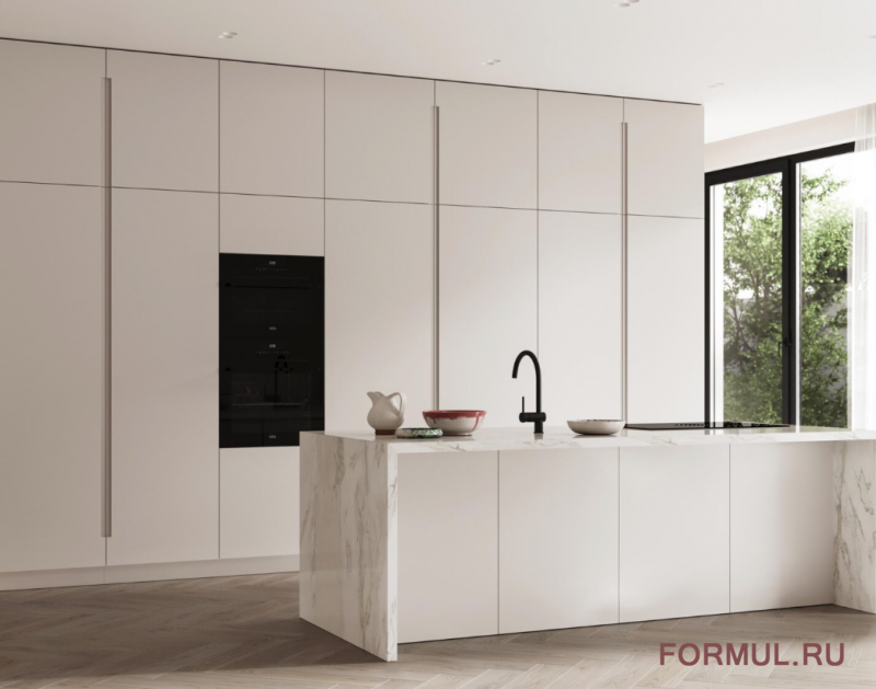 Основная идея этой кухни дизайн через утопленный профиль. Предлагаемая отделка — белый матовый лак pure white. столешница и боковины острова выполнены из мрамора calacatta. Сочетание цветов и материалов, удобства и стиля.