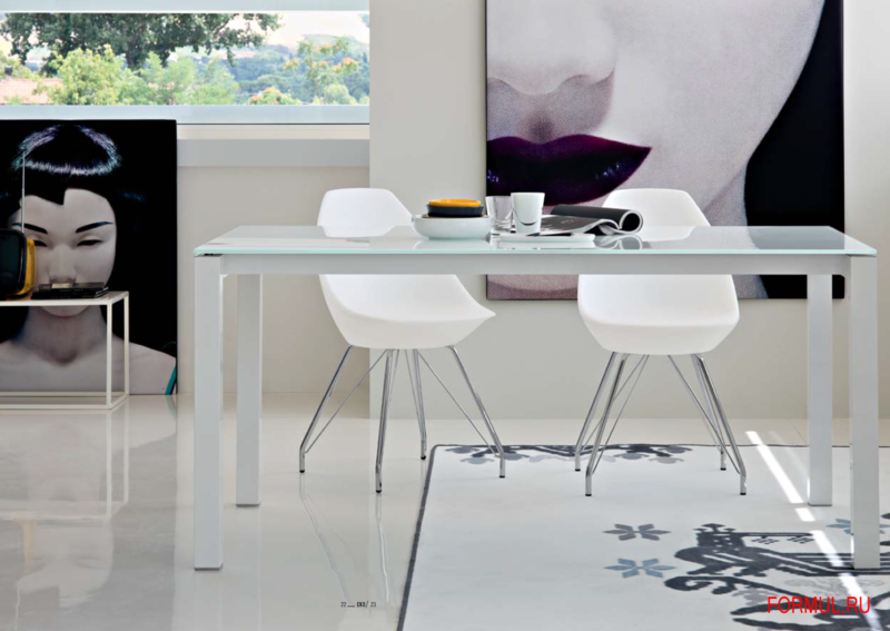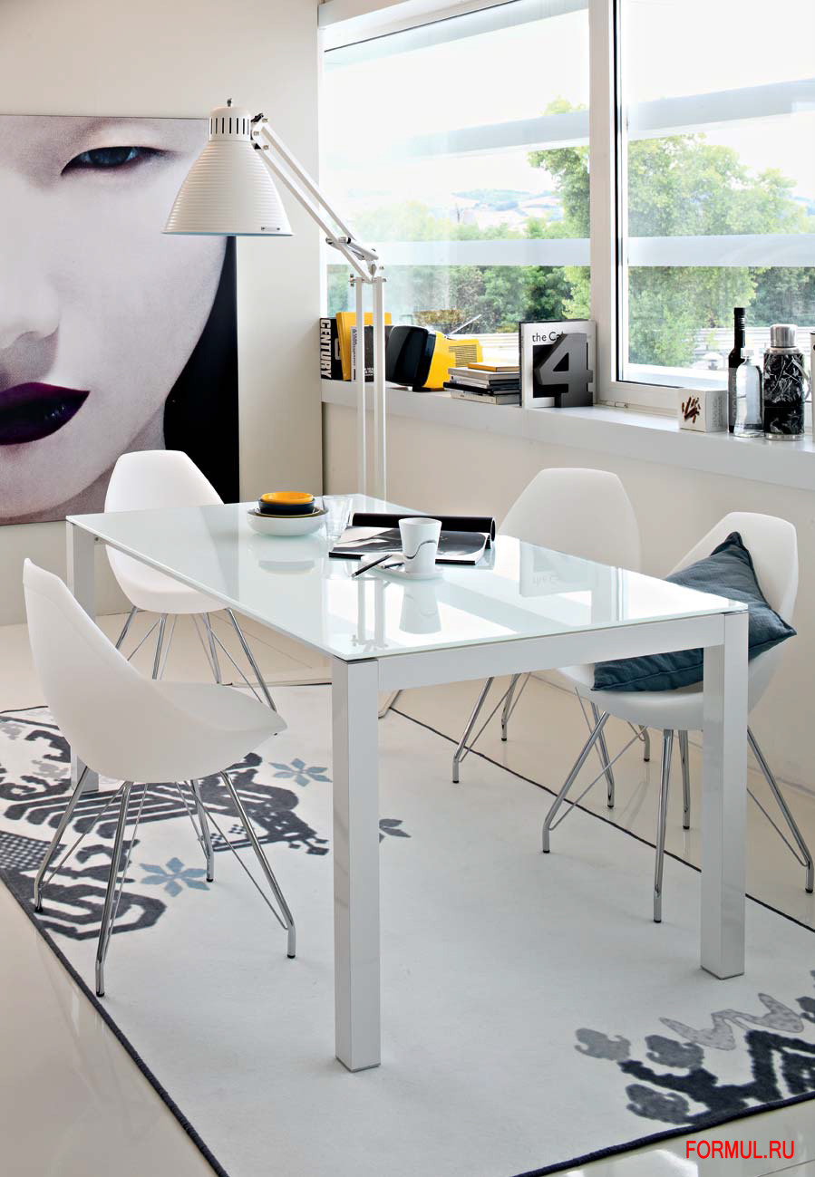Simple, корпус из стали в матово- белой отделке, столешница из закаленного стекла в белом цвете extra-light. Стул Spider из белого полипропилена с хромированным корпусом.
