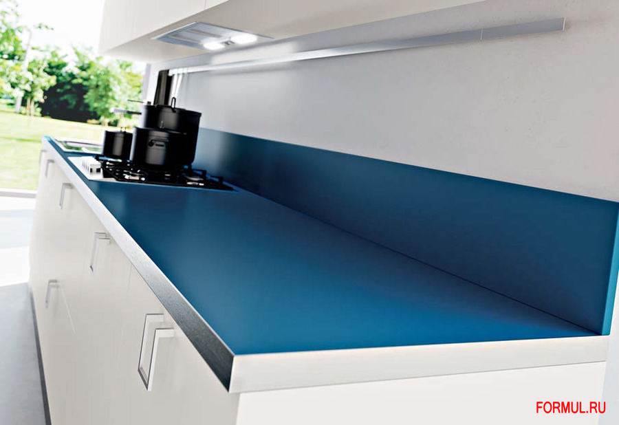 • Столешница с выступом в отделке из синего ламината с бортиком из