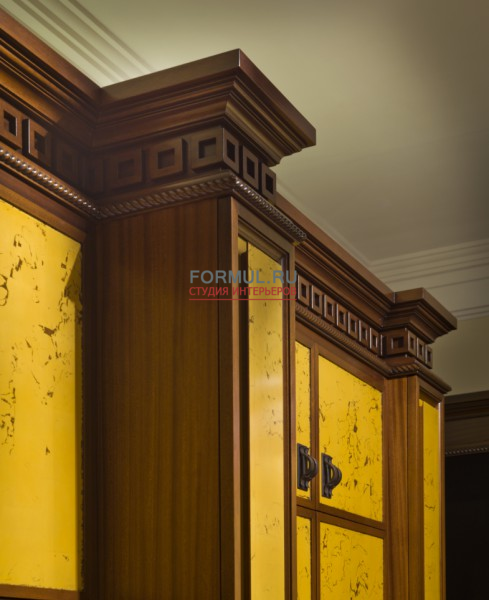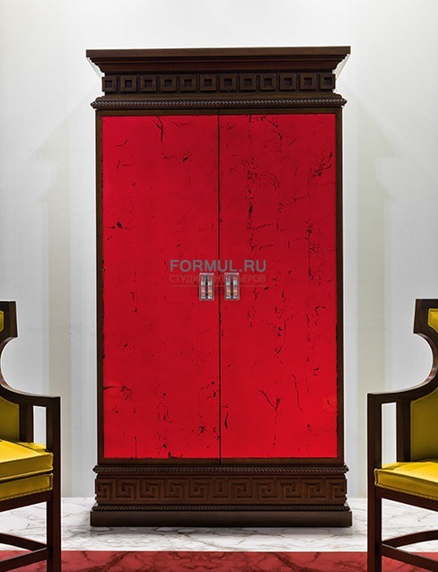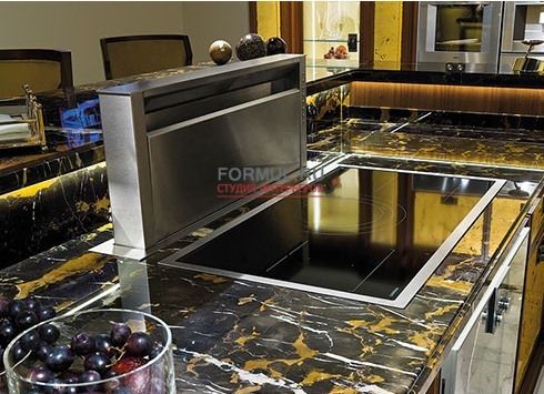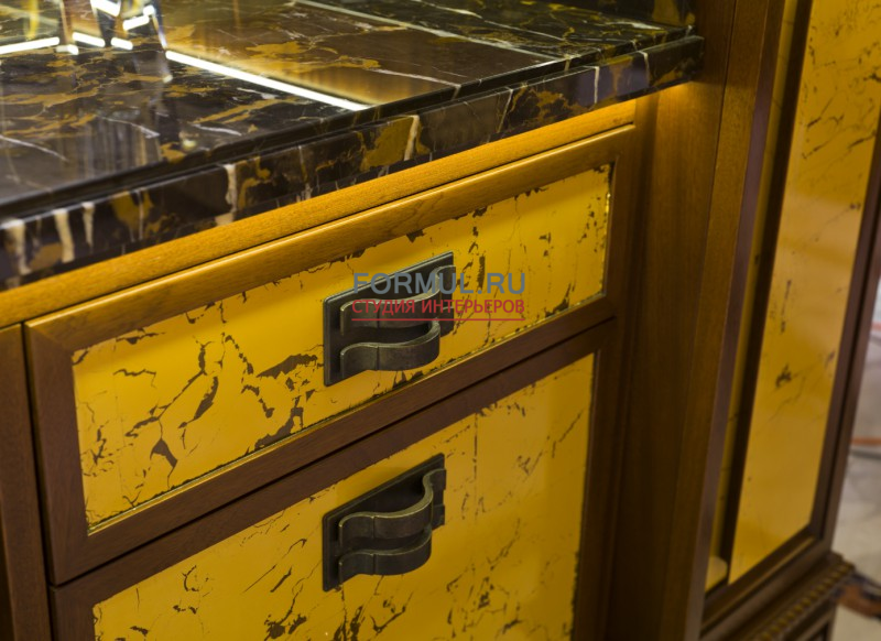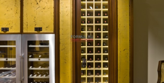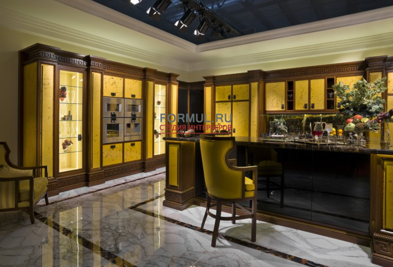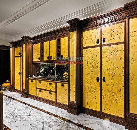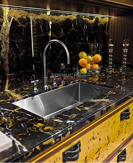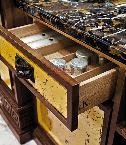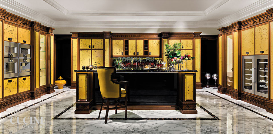 Все материалы тщательно подобраны, чтобы сделать продукт высокого качества в уникальном исполнении. Это кухня сочетает в себе практичность и современный дизайн. Каждая часть отвечает конкретным потребностям: приготовление пищи, прием пищи, стирка, холодильник и места для хранения продуктов. Она прекрасно организована, следуя идее, что в большой кухне, люди должны жить и дышать в повседневной жизни. Элегантная мебель завершает этот уникальный проект: красное дерево, на самом деле, это душа Augusta наряду с твердой древесиной клена. Двери оформлены в желтый лист, покрытый золотом с легким эффектом трещин. Драгоценный черный мрамор и золото подчеркивает каждую деталь и линии. В композиции выделяется бар в красной меди.