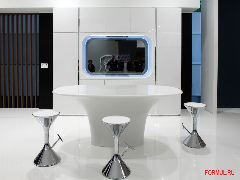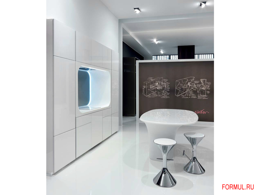 «Кухня – это сердце дома. С этой мыслью я взял то, что часто считается прототипом кухонного пространства и превратил его в элегантный эксперимент». Концепция интерпретируется вокруг острова в форме предистала. Остров необычной формы приглашает семью и друзей занять свои места вокруг. Как смеситель, так и подсветка ЛЕД убираются под гладкую рабочую поверхность. Простое добавление разделочной доски многоцелевого использования над мойкой создаёт устойчевую поверхность, на которой можно накрыть стол. Мягкие изгибы имеют продолжение на блоке у стены. Закруглённый силуэт и пространство для готовки внутри блока. Настенная зеркальная панель обрамлена подсветкой ЛЕД. Колонны под холодильник, духовку и кухонный шкаф открываются с помощью выемки. Использование матового или глянцевого стекла для фасадов, а так же керамики позволяет представить модель в ещё более эксклювном свете, подчеркнув её оригинальность и неповторимость.
