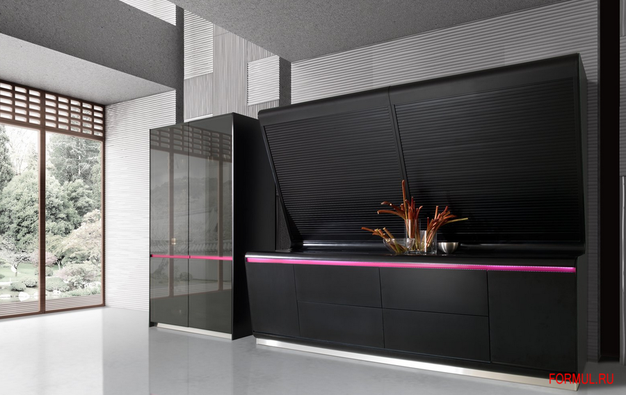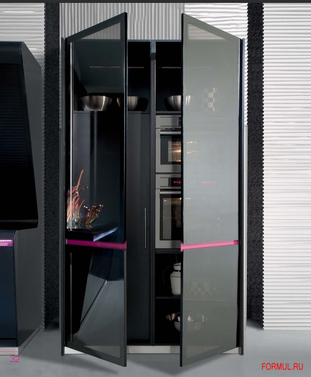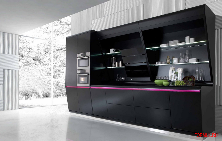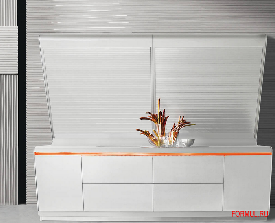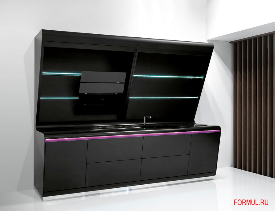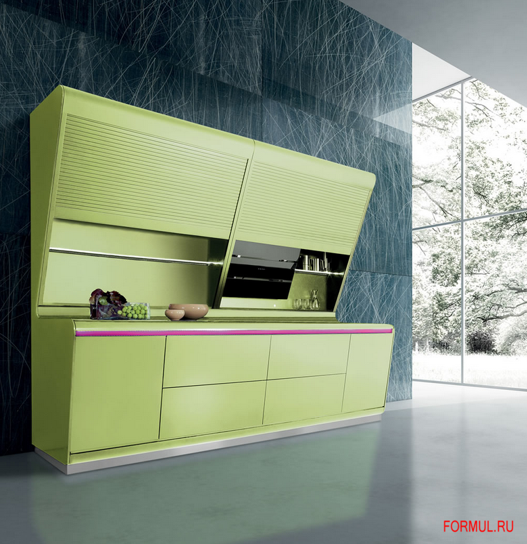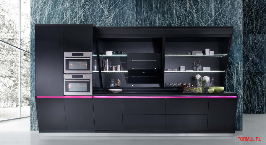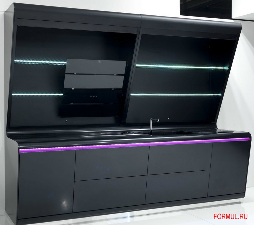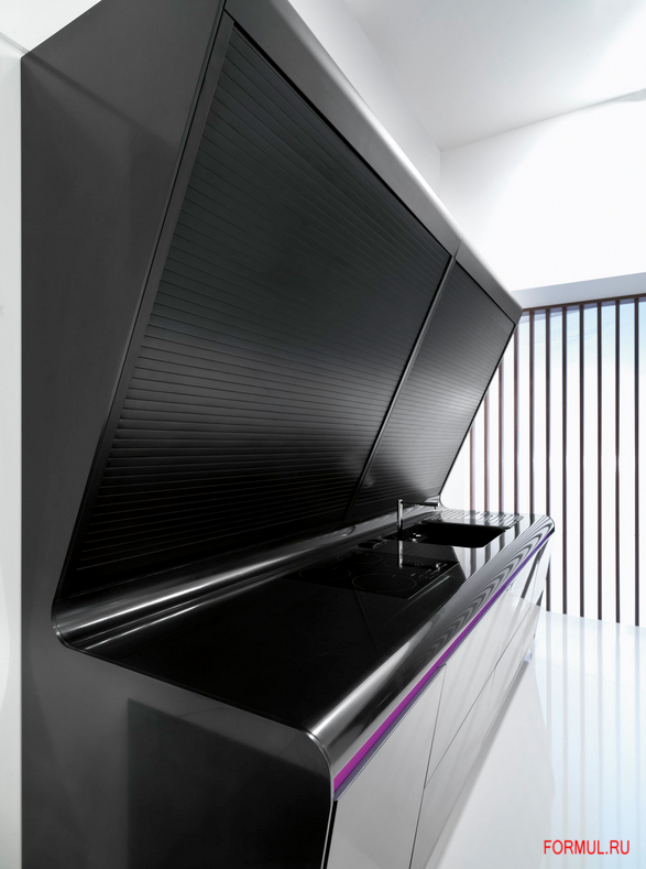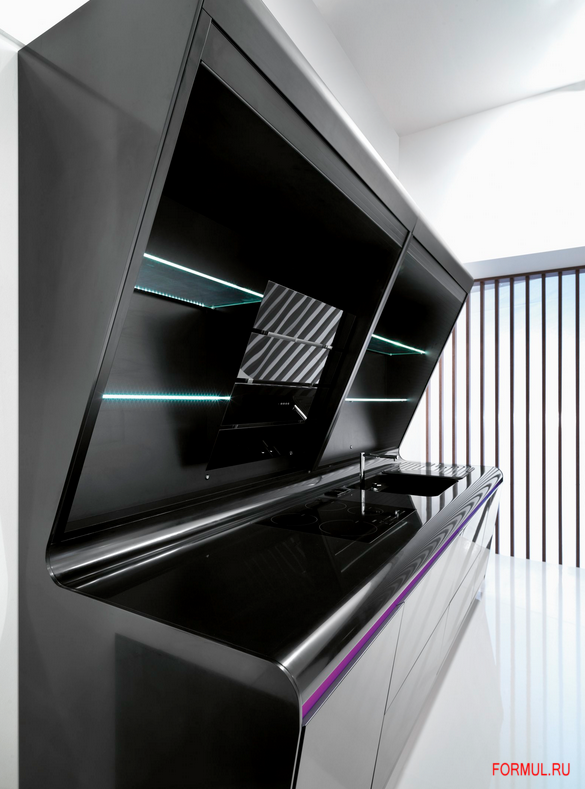 «В дизайне кухонь я следовал принципу минимализма, сочетая «чистые» поверхности с вкраплениями интенсивных цветов. В кухне Kook я трансформировал кулинарный поединок в чисто эстетическое удовольствие». Шкафы появляются так, чтобы предоставить максимальный обзор и доступ к содержимому и исчезают после приготовления. Жалюзи скрывают стеклянные led-полки и вытяжку над плитой. Используя наклонный шкаф, более объемные предметы можно расположить наверху, а маленькие внизу, и превратить готовку в легкомысленное времяпрепровождение. Нижние модули подчеркнуты цветной led-подсветкой, открываются нажатием, и тоже сделаны наклонными, чтобы обеспечить удобный подход к столешнице. Кроме того, Kook презентует мойку, которую можно спрятать под разделочной доской-люком, что создает непрерывную поверхность. Использование фасадов из кориана в алюминевой рамке порождает союз технологии, долговечности и минималисткой эстетики.