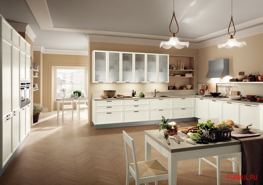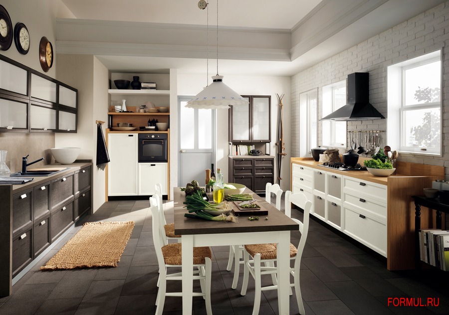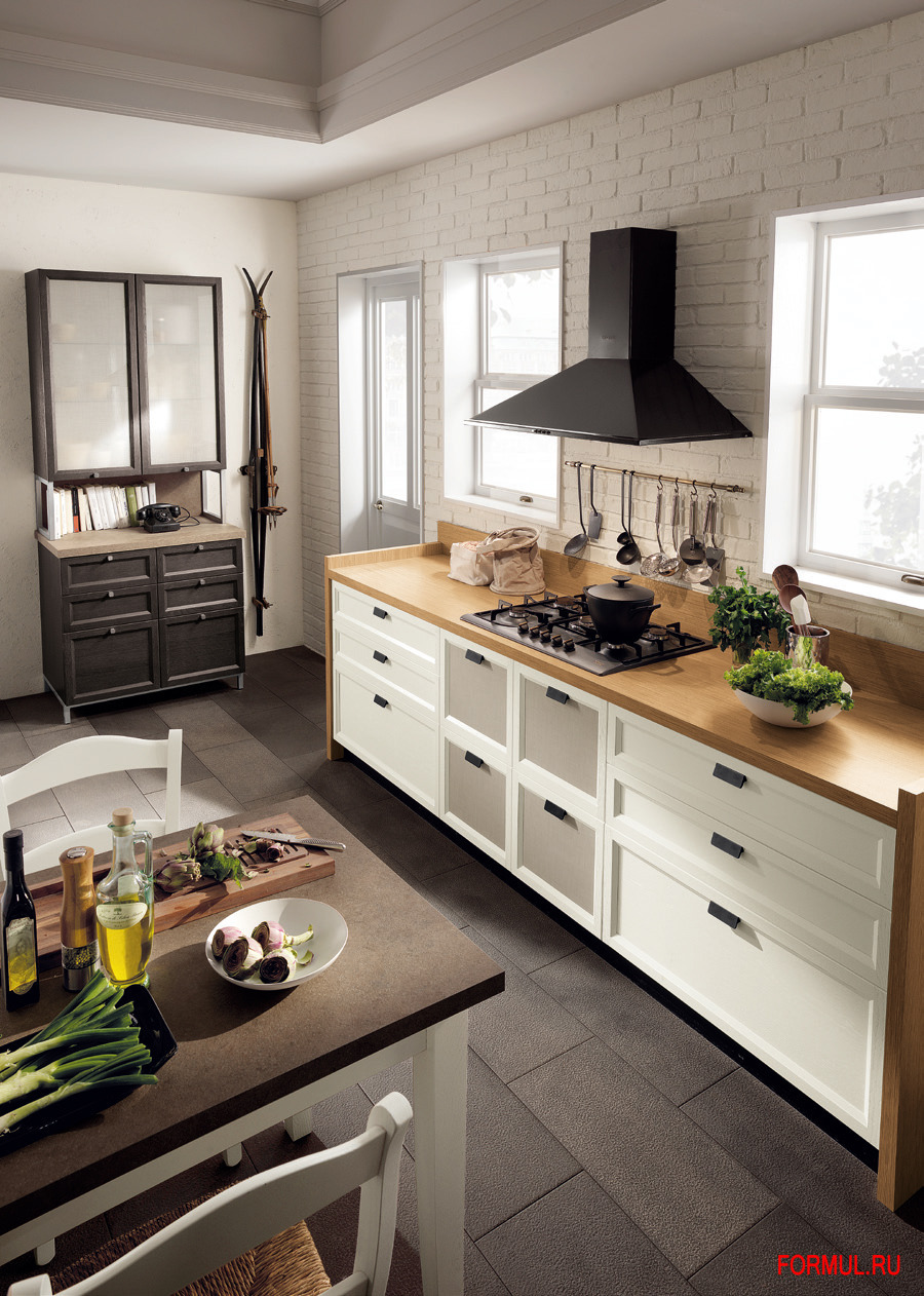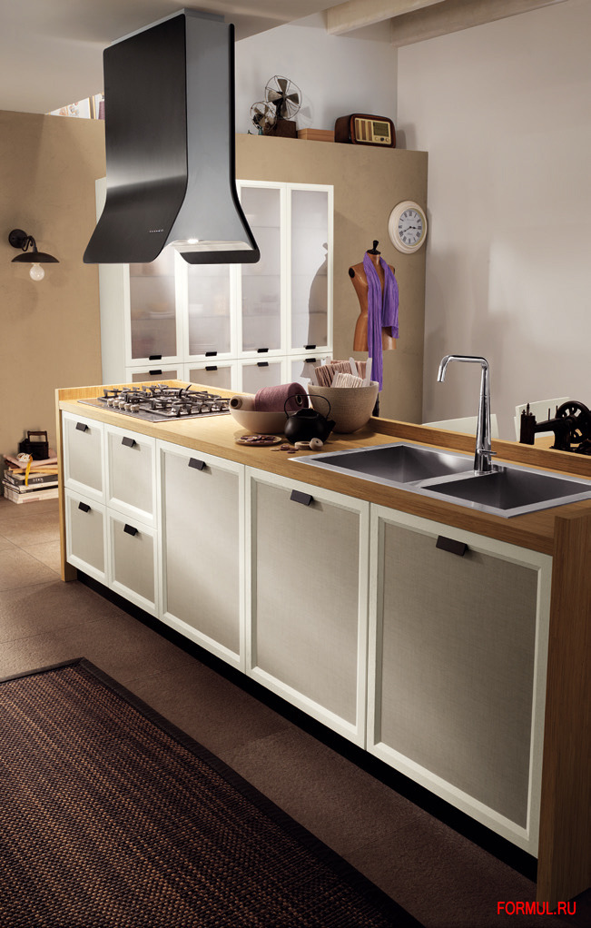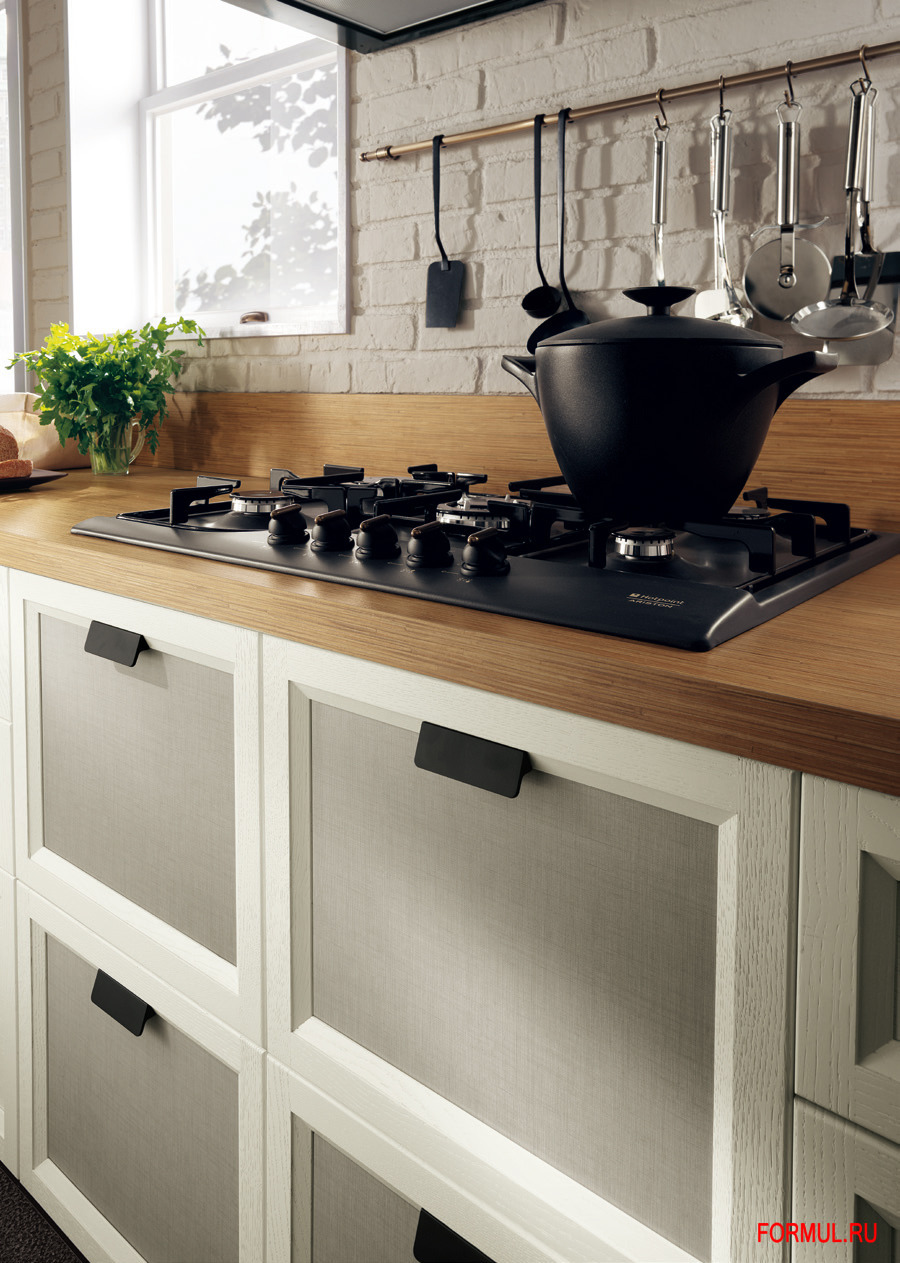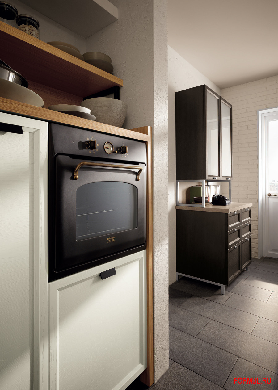 Модель Atelier, несмотря на единую створку, предлагает широкое разнообразие вариантов, которые дают возможность переходить от кухни классического итальянского стиля к стилю "прованс", или к североевропейскому стилю, вплоть до "хай-тека". И при всём при этом, изысканность и винтажность базовой модели сохраняются.