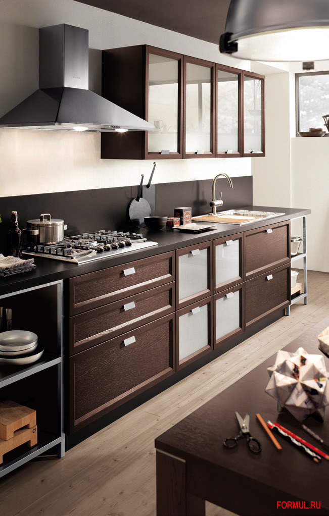 Разнообразию стилевых решений кухни Atelier способствуют, в первую очередь, композиции: помимо обычных угловых или линейных композиций, модель Atelier предлагается также и в конфигурации из функциональных блоков, где плита или мойка, например, находятся внутри высоких боковых стенок из ламината.