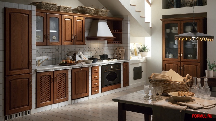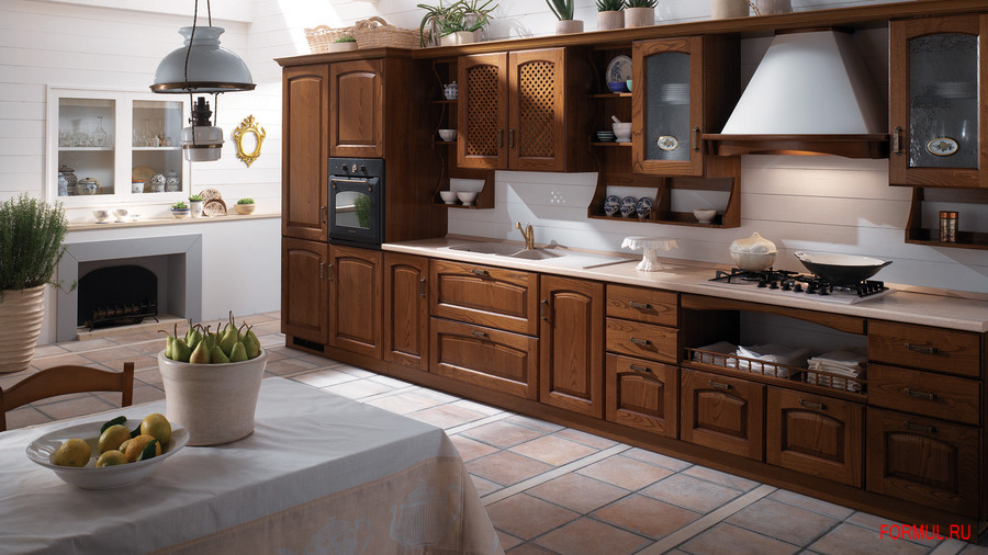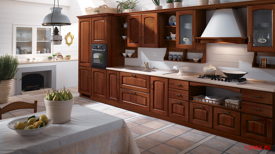 Кухня в классическом стиле. Каркас - ламинированная ДСП (толщина 18 мм) класса Е1 с низким содержанием формальдегида. Фасады (толщина 21 мм) выполнены из массива каштана с филенкой из лакированной МДФ. Могут быть "глухие", решетчатые, с закаленным стеклом толщиной 4 мм. Доступны любые оттенки из коллекции компании. Задняя панель из ДВП толщиной 3 мм в отделке лаком. Панели нижних ящиков из окрашенного металла, днище покрыто меламином. Ручки под состаренную латунь. Гарнитур дополняется открытыми навесными полками из ламинированной ДСП толщиной 30 мм и металлическими сушилками для тарелок.