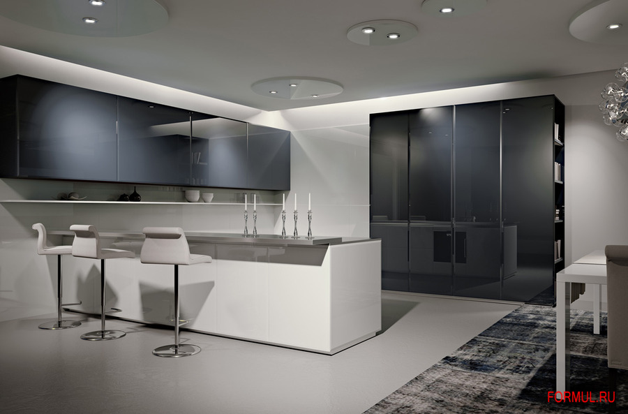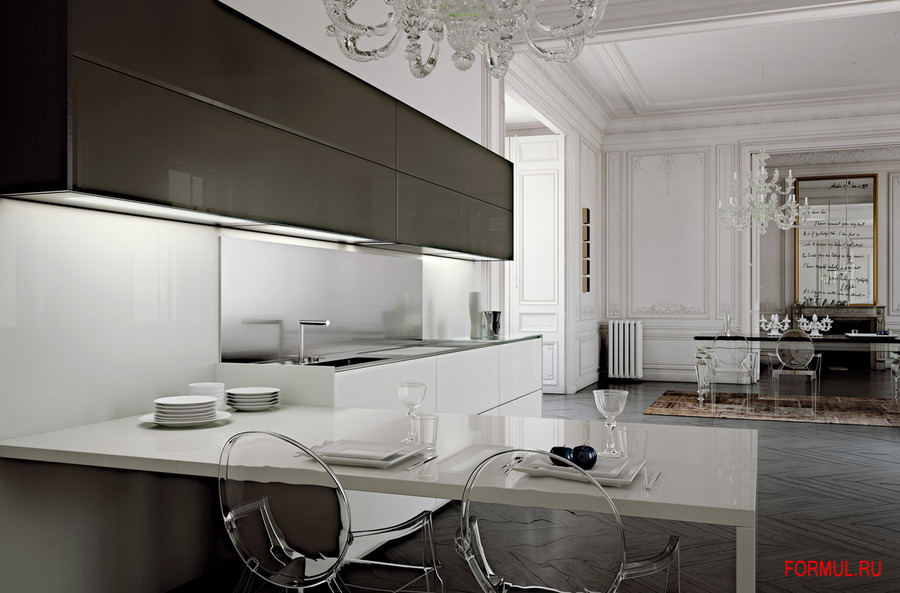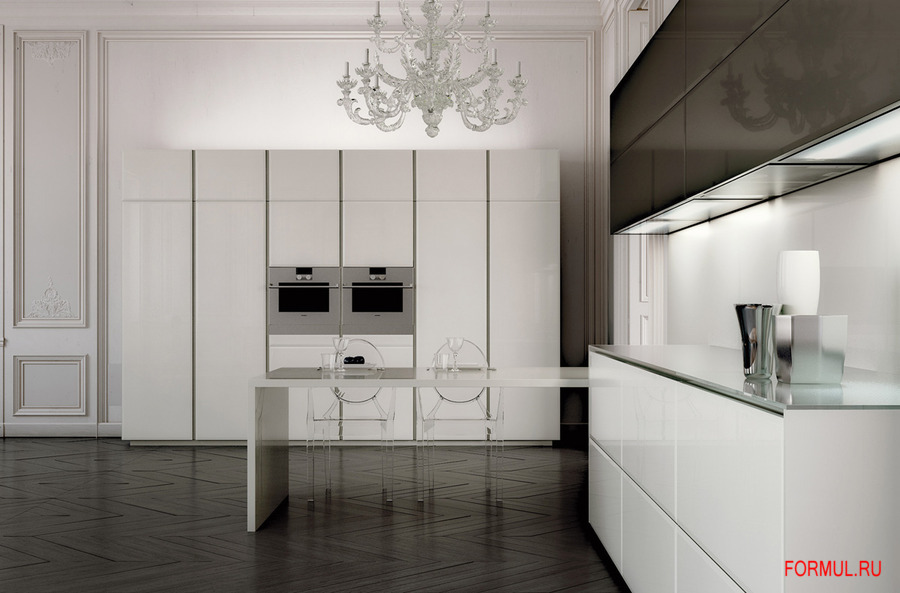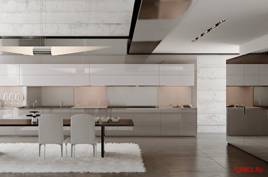 Кухонный гарнитур в современном стиле. Фасады выполнены из стеклянных панелей с фаской и без. Предлагается три варианта отделки: травление, полирование, декор в виде точек. Поверхности могут быть покрыты лаком с отражающим эффектом. Комплектация модели, отделка, размеры исполняются в соответствии с индивидуальными предпочтениями заказчика.