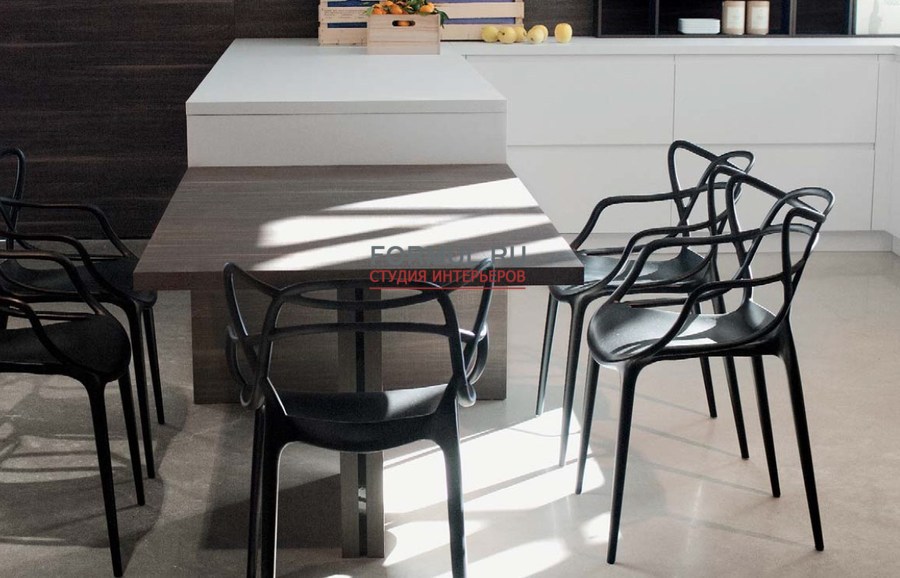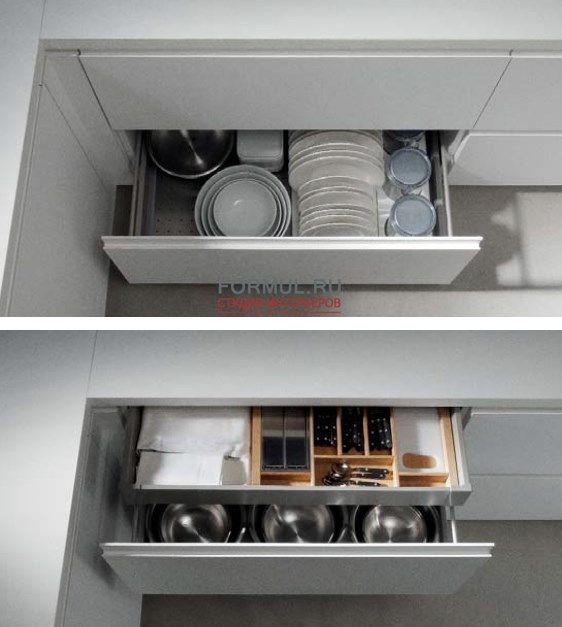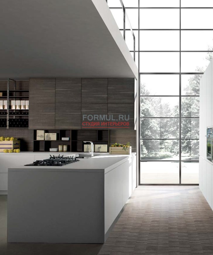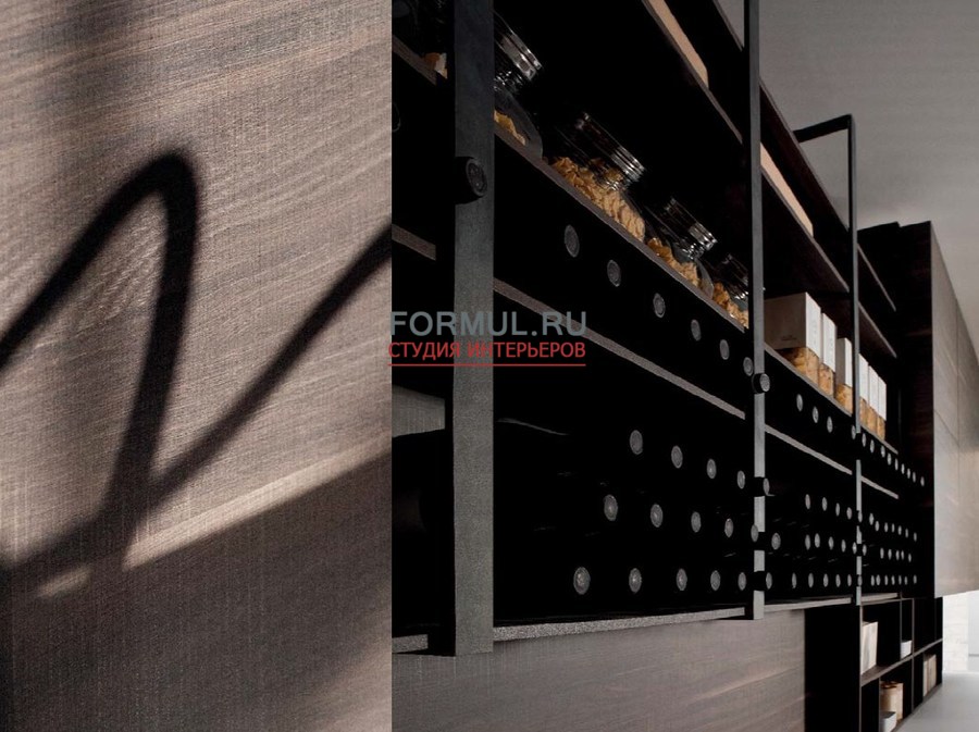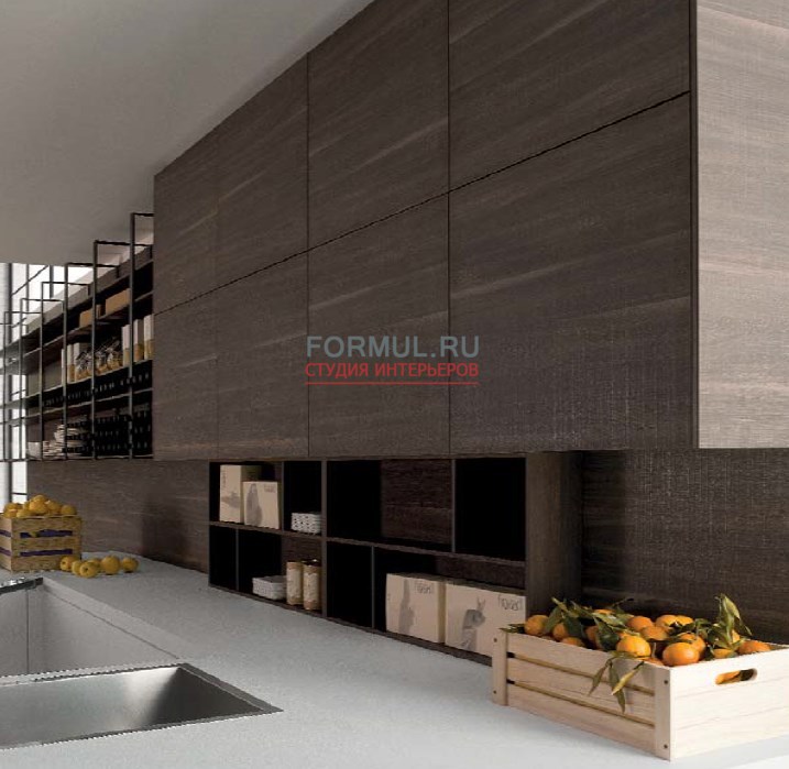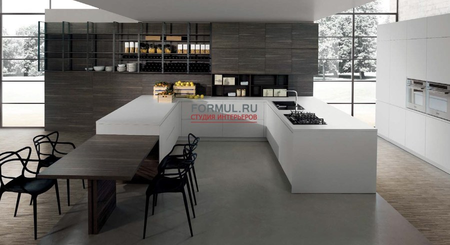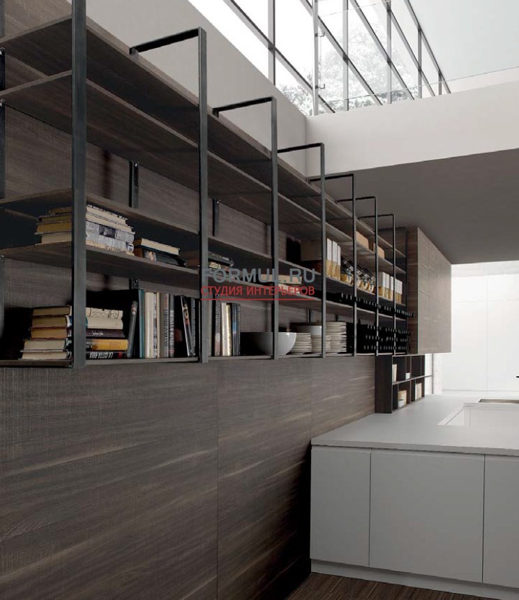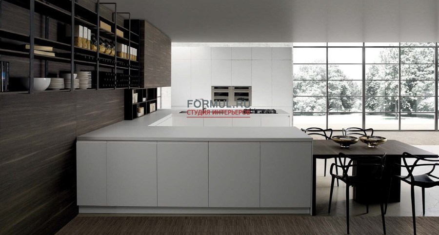 Неоклассика и минимализм. Кухня очень уютна и многофункциональна. Открытая система полок в полированном железа, шелковая матовая поверхность дарит приятные ощущения от прикасания.