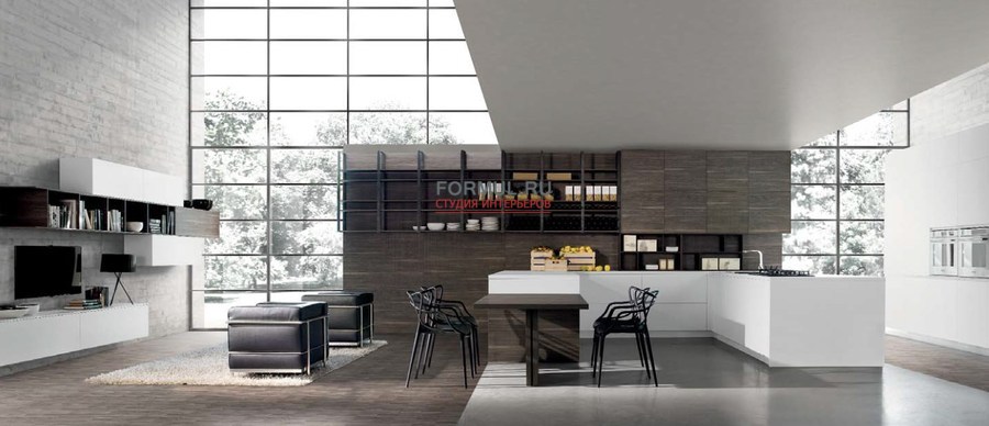 Кухонная мебель превосходно подстраивается под нужды гостиной и образует единое пространство дизайна интерьера. Высота верхних шкафов вариативна.