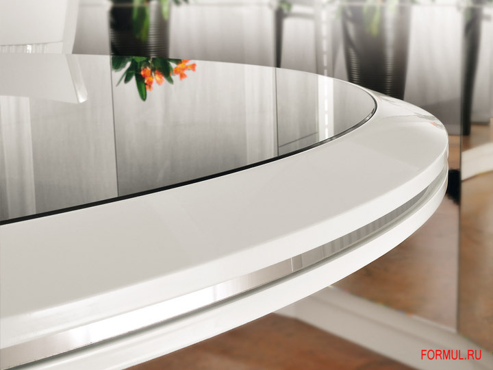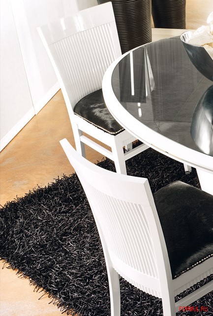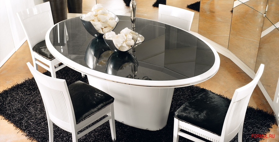 Стол из серии Diamond овальной формы выглядит очень элегантно и парадно, благодаря сочетанию черной кожи по всему топу и вставке из супертонкого и прочного прозрачного стекла. Основание из стали с лакированной глянцевой поверхностью. Стулья также обтянуты черной кожей и декорированы клепками по краям сидушки.