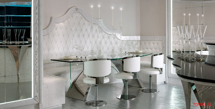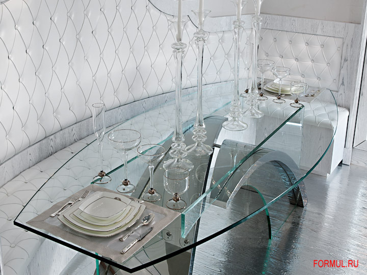 Обеденный стол из закаленного стекла необычной формы с опорой из массивной стальной конструкции в виде дуги. В комплекте также есть величественная банкетка с ромбовидной стяжкой по сиденью и всей спинке, стулья в более современной форме с вращающимися сиденьями, обтянуты белой кожей.