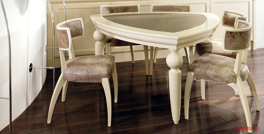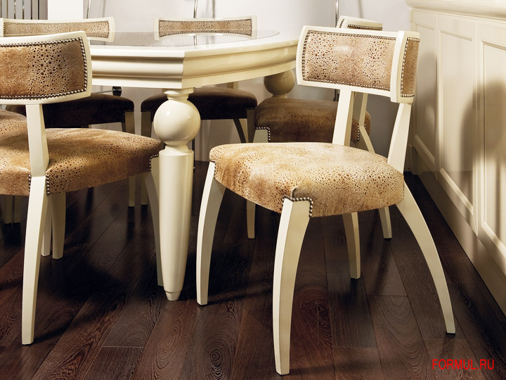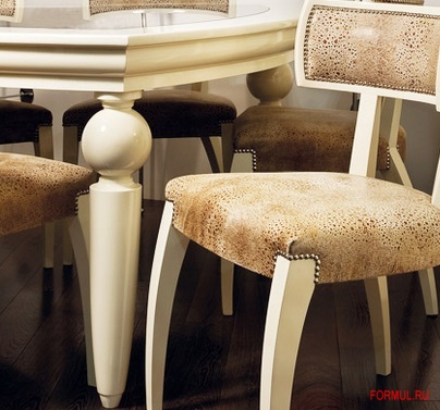Изысканный аккуратный стол с фигурными объемными ножками лакированный в теплый белый цвет со вставкой из сверсветлого окрашенного стекла на топе. Стулья имеют невысокую спинку и обшиты особенной кожей "pelle di rospo" по всему сиденью. По краям декорированы заклепками.