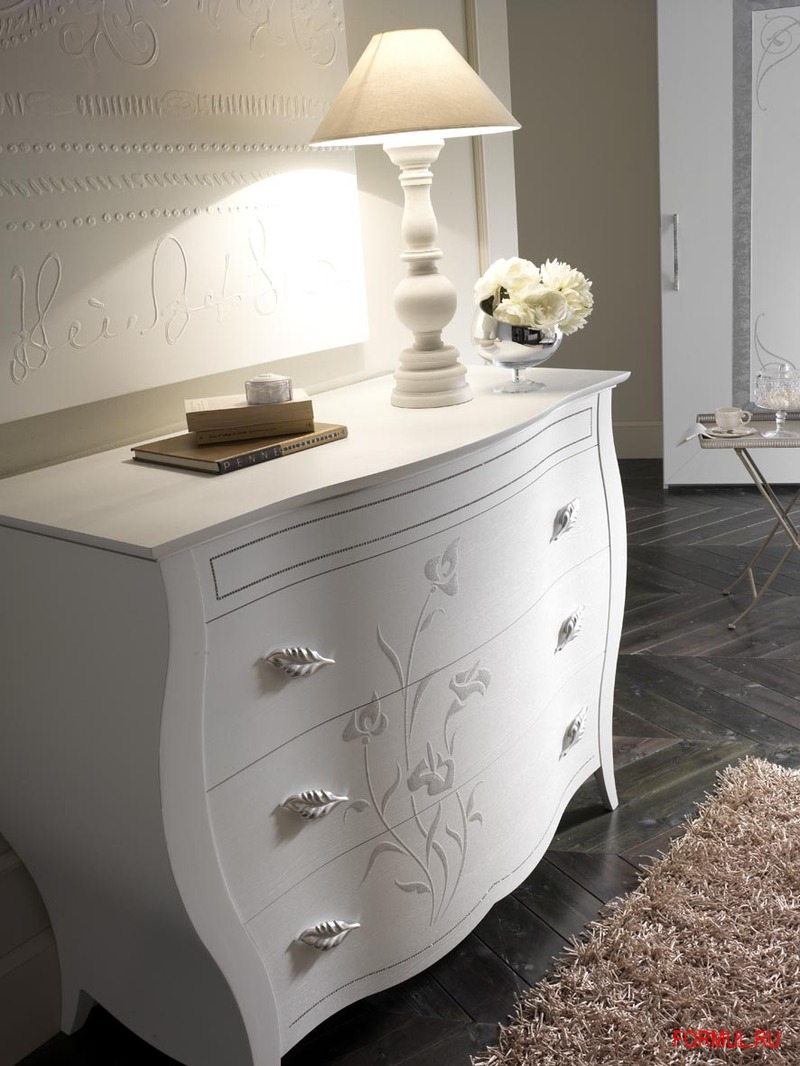 Тумбочка прикроватная и комод – покрытие белое лакированное. Особенность являются изогнутые гладкие формы покрытые лаком. Поверхности тумбочки и комода изготовлены из МДФ толщиной 30 мм. и покрыты белым глянцевым лаком с нанесением декоративных узоров в цвете серебро. Внутренняя структура изготовлена дерева толщиной 18 мм., снаружи покрытого меламиновыми панелями категории Е1. На верхнем и нижнем ящике имеются декоративные элементы в виде кристаллов Swarovsky. Ручки на ящиках изготовлены из никеля и имеют отделку «под старину». Ящики оснащены доводчиками и скрытыми рельсами по которым осуществляется плавное движение.