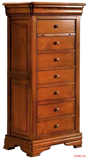 Высокий комод в классическом стиле. Модель с семью выдвижными ящиками в традиционном соединении "ласточкин хвост" дополнена выдвижным топом (расположен под верхним ящиком). Материал - древесина вишни. Отделка поверхностей – лак, пчелиный воск.
