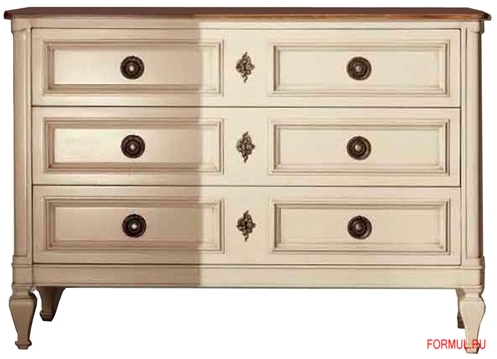 Комод с тремя выдвижными ящиками в традиционном соединении "ласточкин хвост" (запираются на ключ). Выполнен в классическом стиле. Материал – древесина ореха и вишни. Отделка поверхностей – лак белого цвета, пчелиный воск.