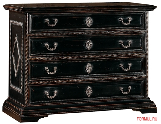 Комод в классическом стиле. Выполнен из древесины, окрашенной под черное (эбеновое) дерево. Включает четыре выдвижных ящика в традиционном соединении "ласточкин хвост". Отделка поверхностей – лак, пчелиный воск.