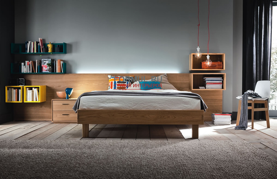 Кровать Nook с широким изголовьем из массива дуба, оснащенным полками LB-ZN7260. Структура — массив дуба в натуральном или цветном лаке. Ручная отделка фасадов с элементами старения, шлифовки, рельефного рисунка поверхности.