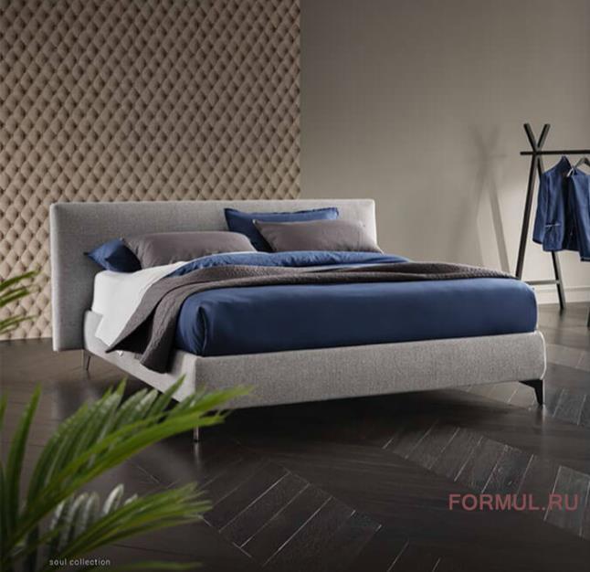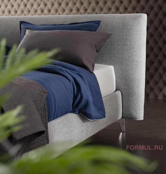 Смелый дизайн кровати с мужским характером подчёркнут изголовьем, слегка выступающим по бокам. Мягкие набивные формы создают приятный контраст с изысканными металлическими ножками.