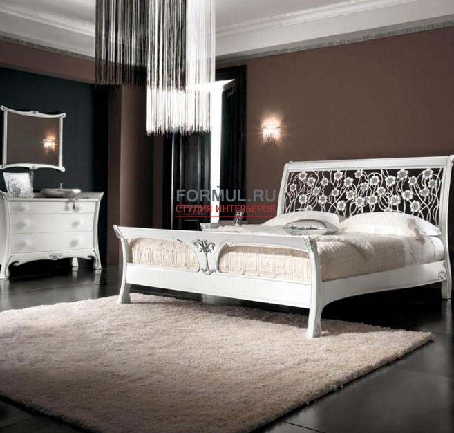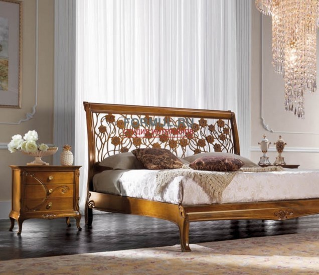 Итальянская двуспальная кровать выполнена в классическом стиле. Каркас сделан из массива дерева, украшен резьбой ручной работы. Отделка - орех. Возможно исполнение в отделке - белый лак. Высокое изголовье кровати может быть дополнено экокожей и с высоким изножьем.