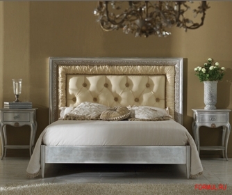 Двуспальная кровать с высоким изголовьем в тканевой обивке, декорированной стежкой-капитоне. Рама, украшенная резьбой ручной работы, покрыта серебром.