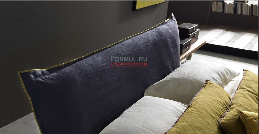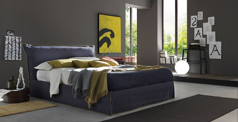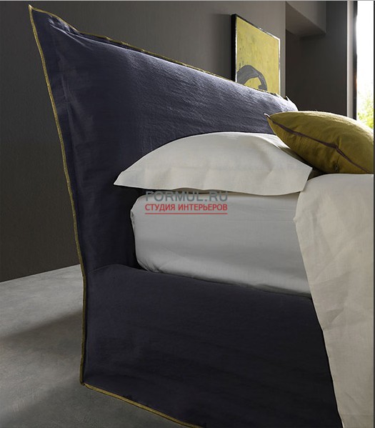 Описание: данная модель является простой, но необычной: кровать имеет особую форму спинки, подчёркнутой швами по всему её контуру. Изделие покрыто мягким подолом и имеет стильный дизайн изголовья благодаря контрастными швами.
