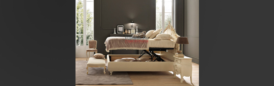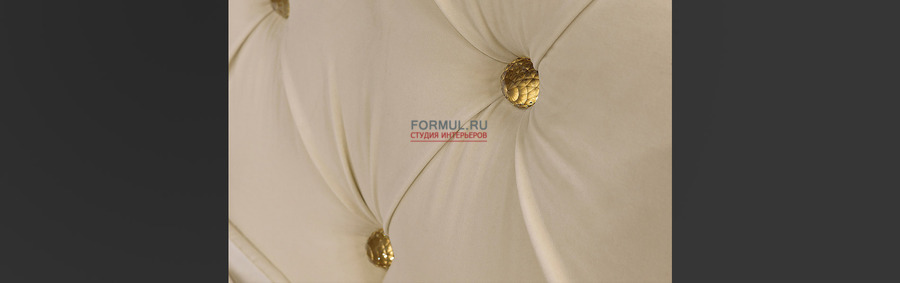 Высокое изголовье с классическим резным декором обитое тканью, декорировано капитонэ. В качестве опции возможно использовать кристалы Swarovski. Основание с подъемным механизмом. Деревянные ножки.